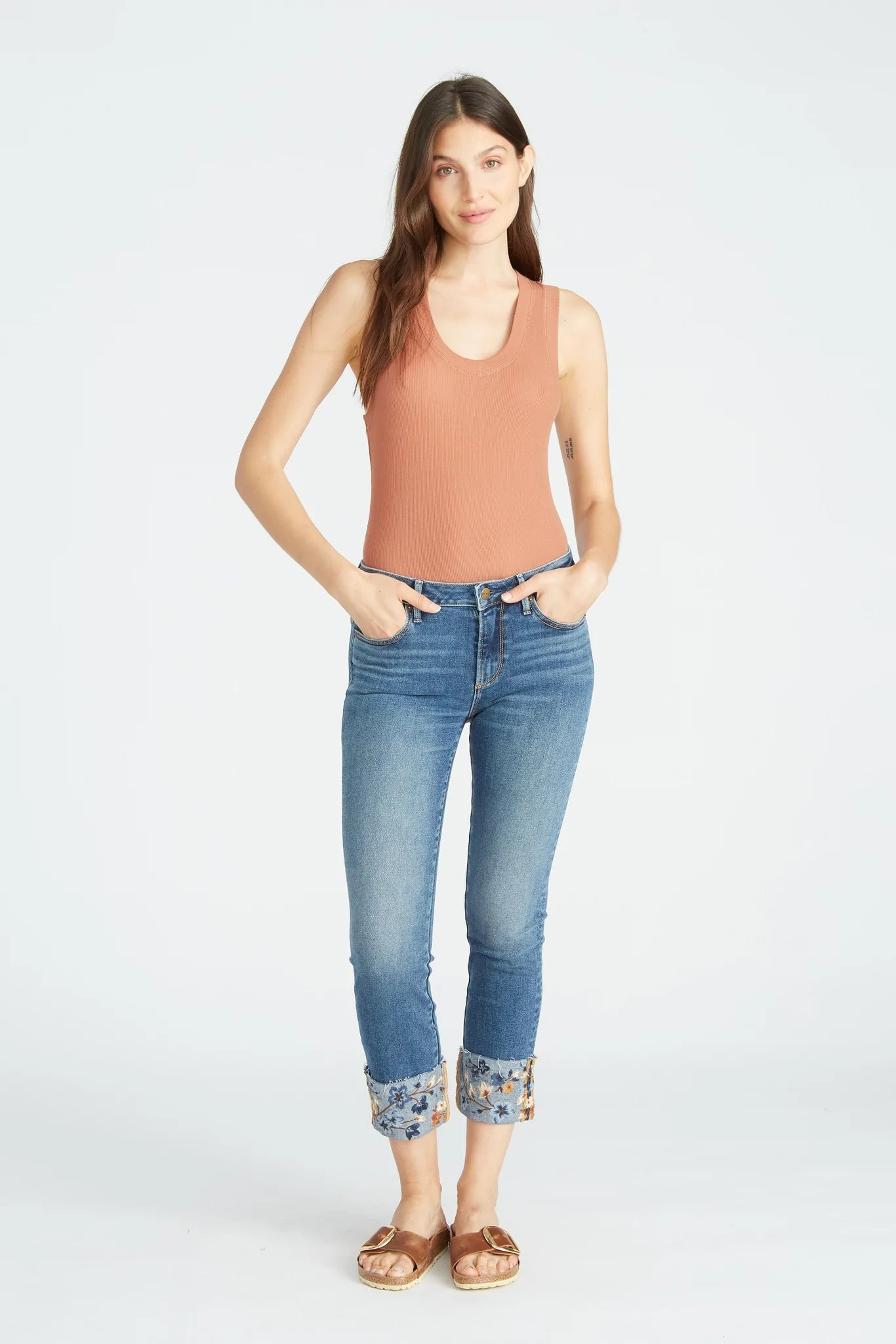 Colette Straight Crop with floral embroidered Cuff in medium Wash.