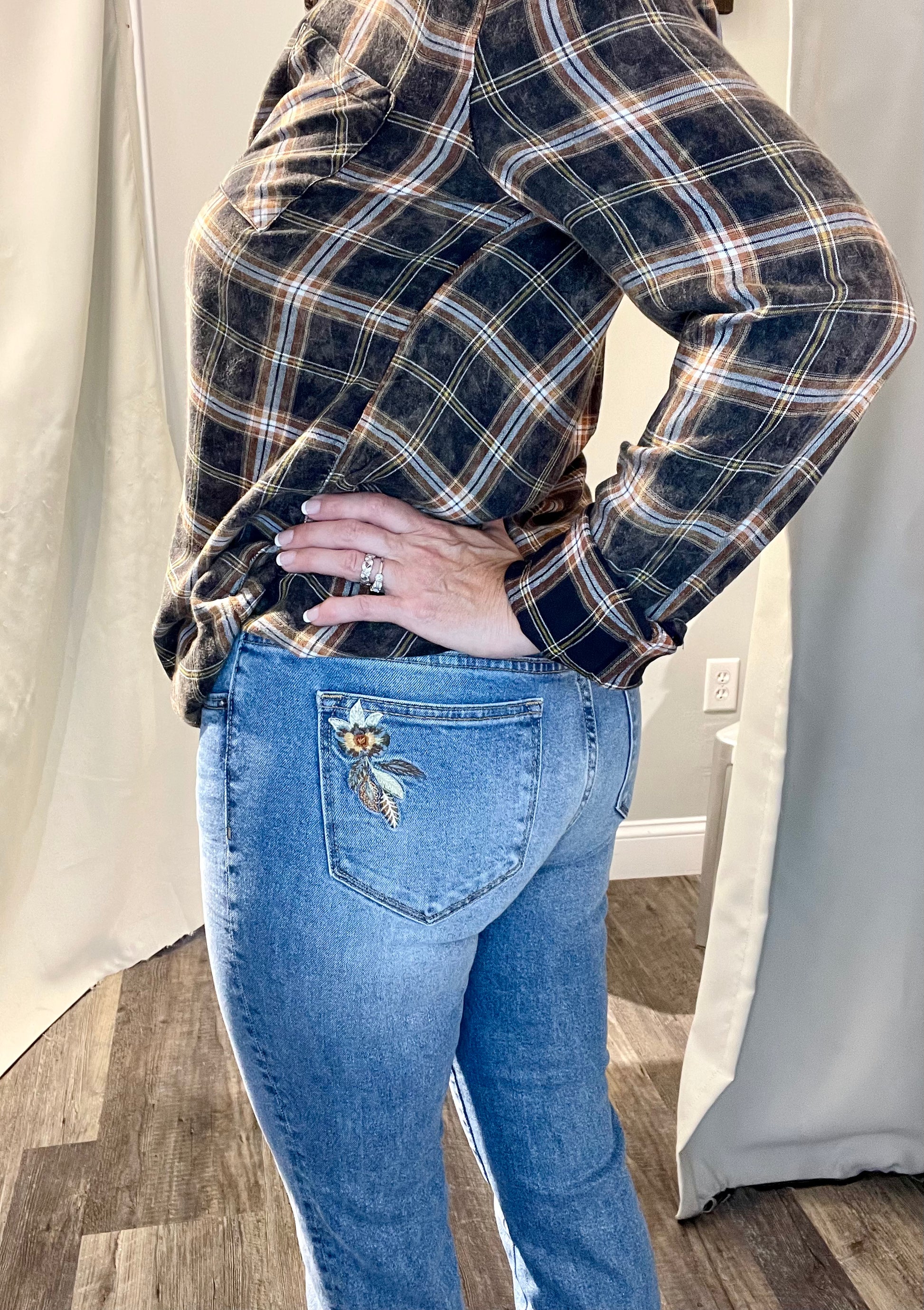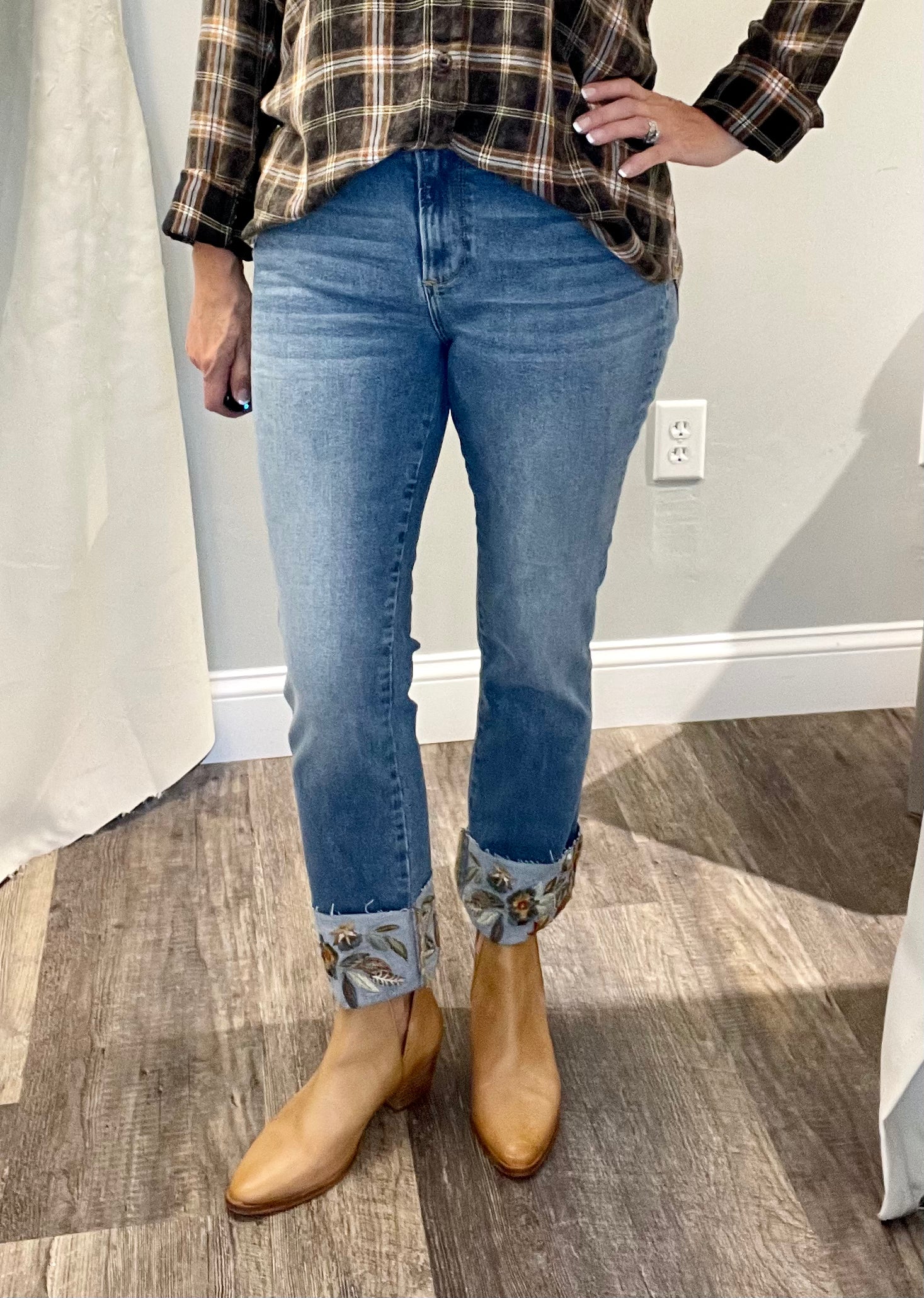 Colette Straight Crop with floral embroidered Cuff in medium Wash.