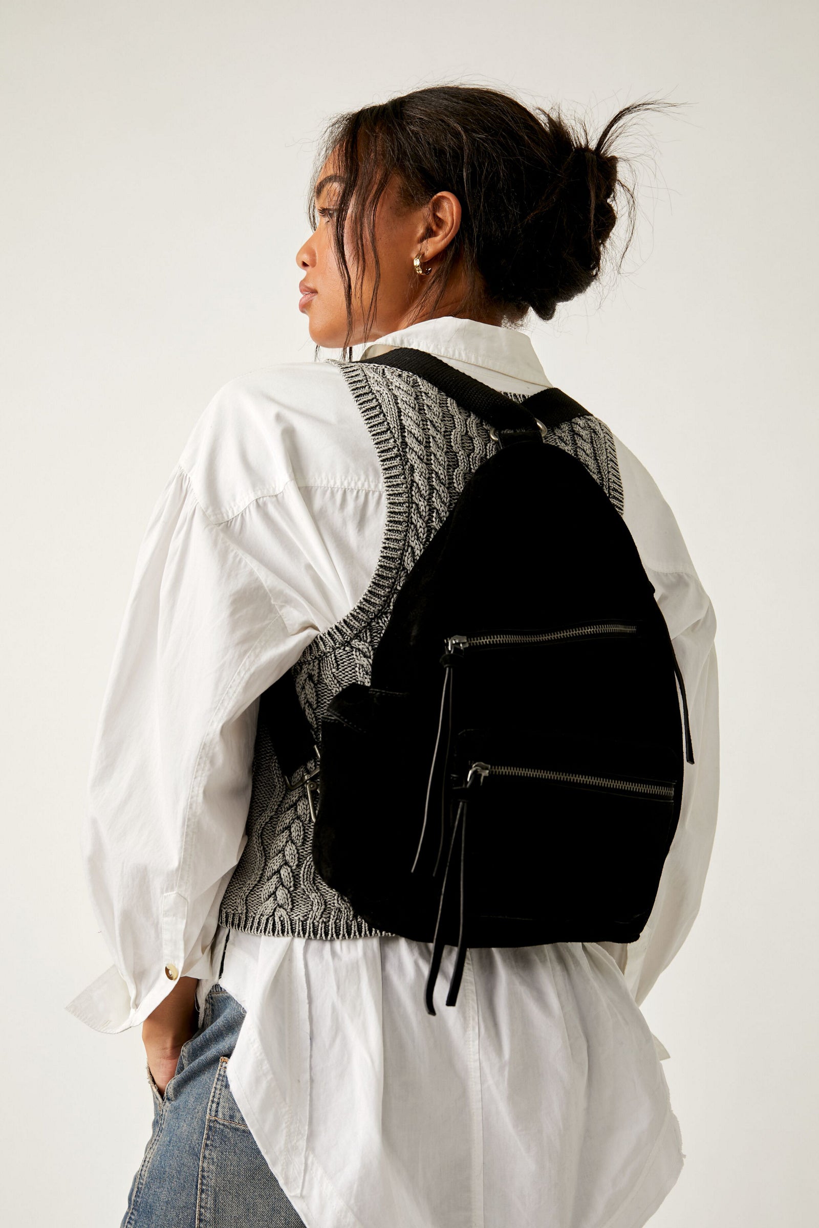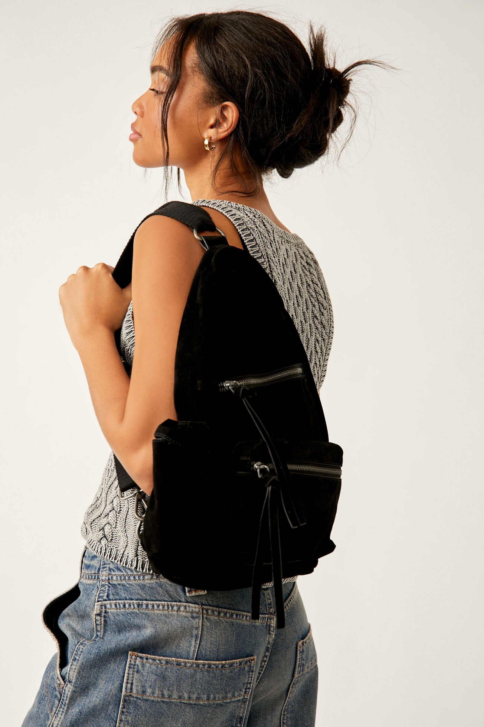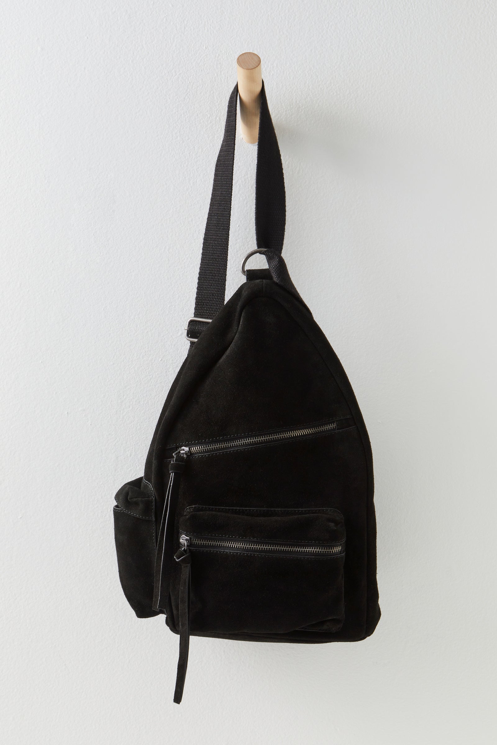 Awesome everyday suede sling backpack / crossbody! Natural black suede handbag has 3 zippered pockets and a side pocket!