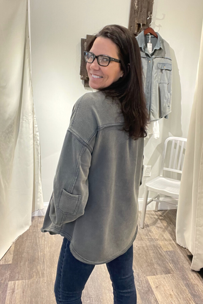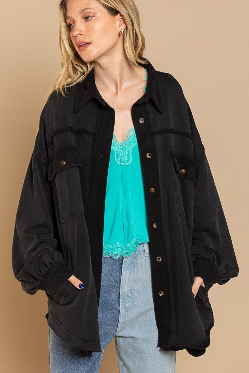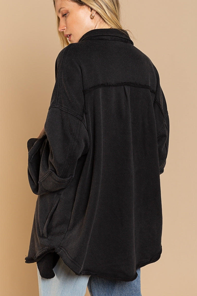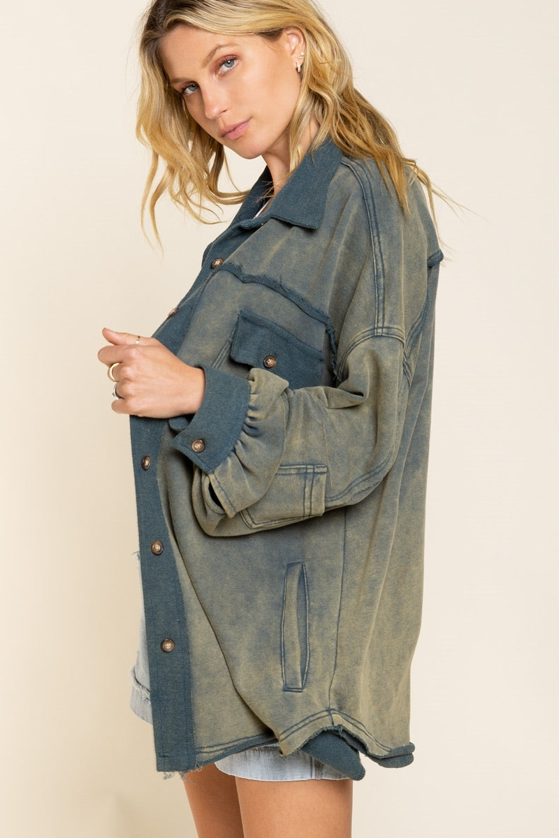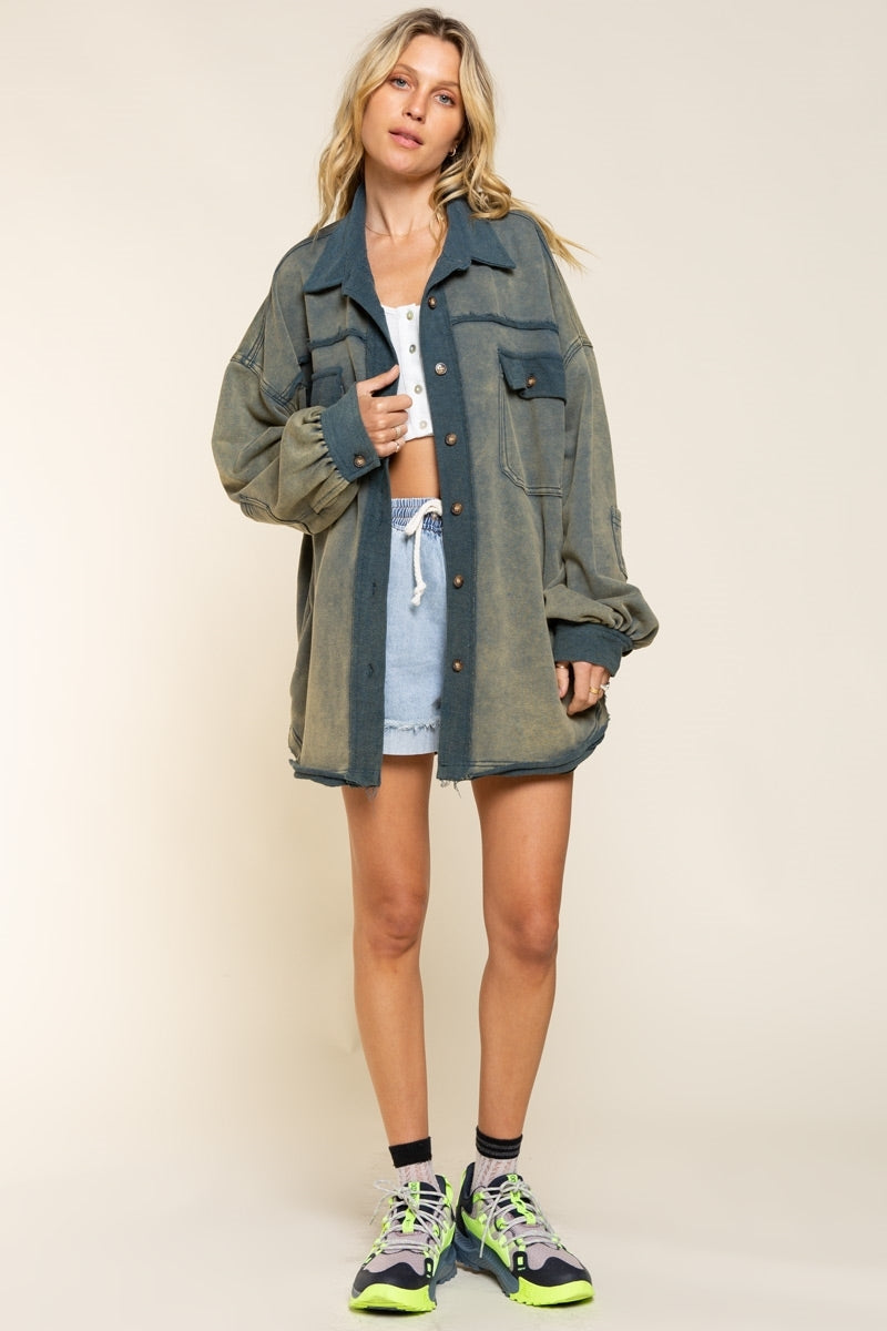 Classic pieces are everyone's favorite and our "Upgrade The Classic Look" french terry oversized jacket will be the new "classic" piece to keep in your closet. Designed in a relaxed oversized fit with vintage washed out colorway. A french terry (sweatshirt) fabric that has been flipped with inside being on the outside on the collar, button front placket closure and sleeve band for vintage vibe. A jacket with 4 pockets with 2 flap pocket on front bust and 2 bottom side pockets and finished with raw seam detailing and edge on body.