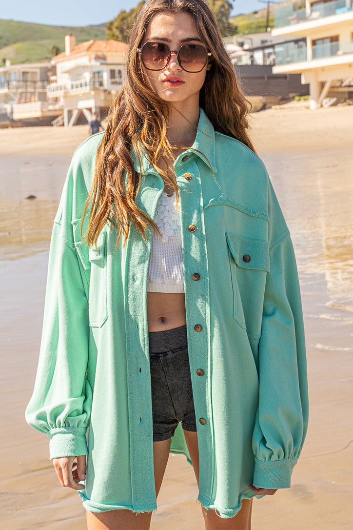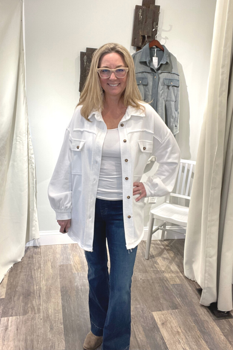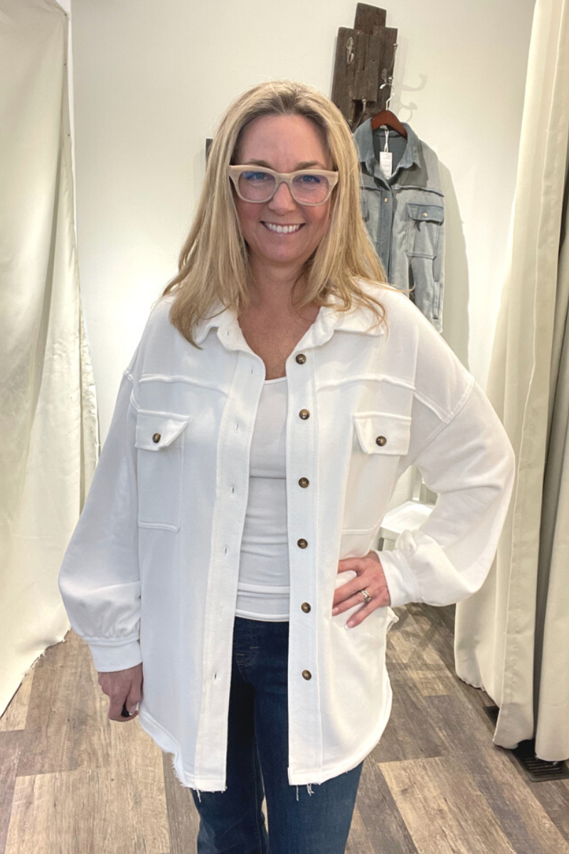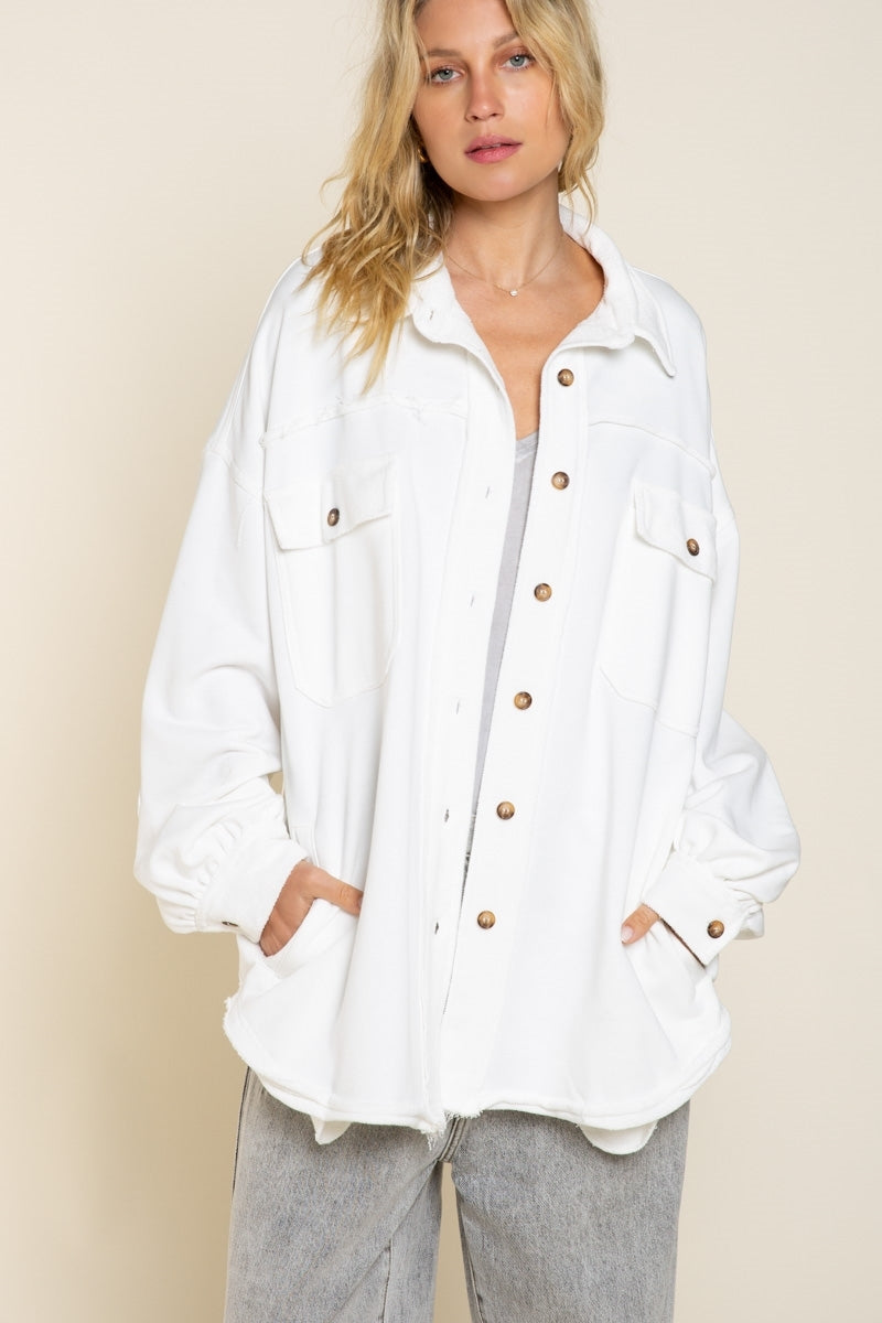 Classic pieces are everyone's favorite and our "Upgrade The Classic Look" french terry oversized jacket will be the new "classic" piece to keep in your closet. Designed in a relaxed oversized fit with vintage washed out colorway. A french terry (sweatshirt) fabric that has been flipped with inside being on the outside on the collar, button front placket closure and sleeve band for vintage vibe. A jacket with 4 pockets with 2 flap pocket on front bust and 2 bottom side pockets and finished with raw seam detailing and edge on body.