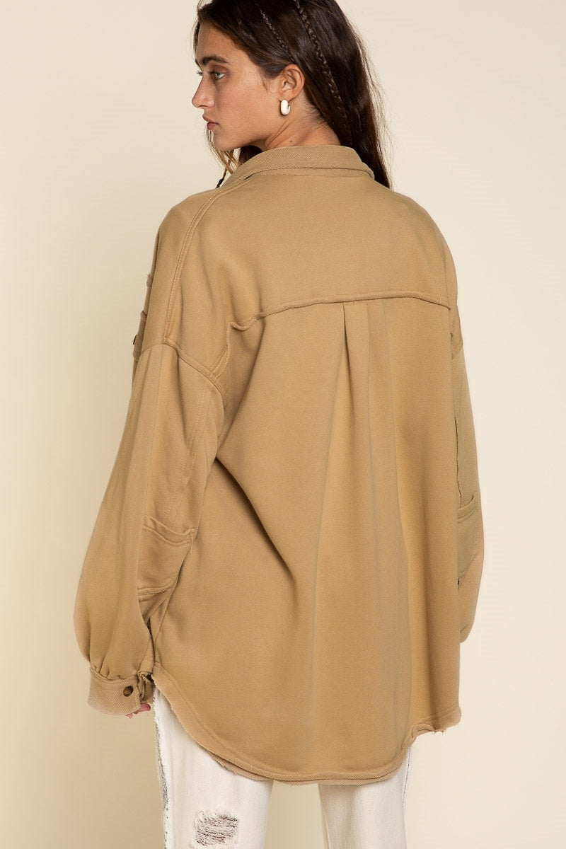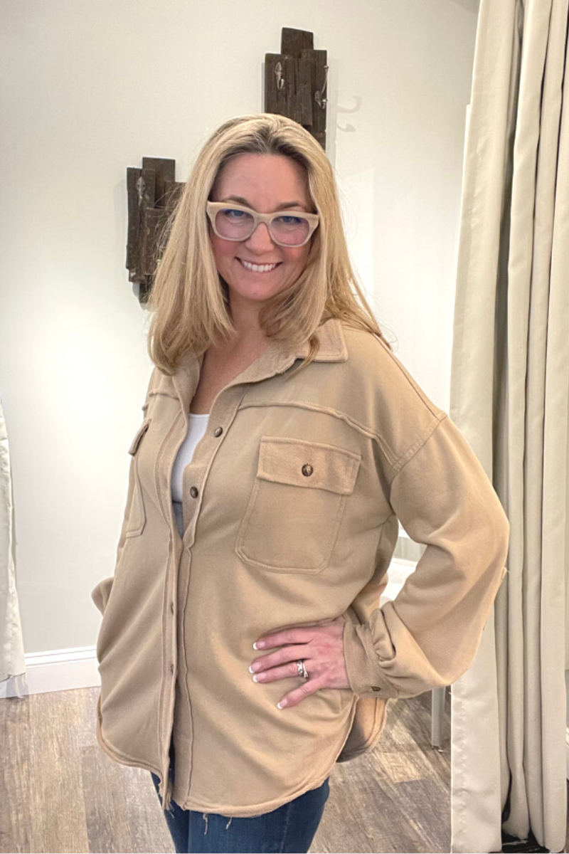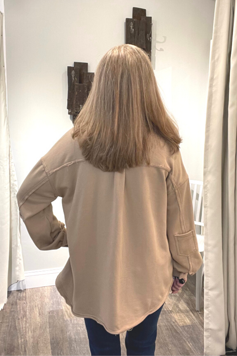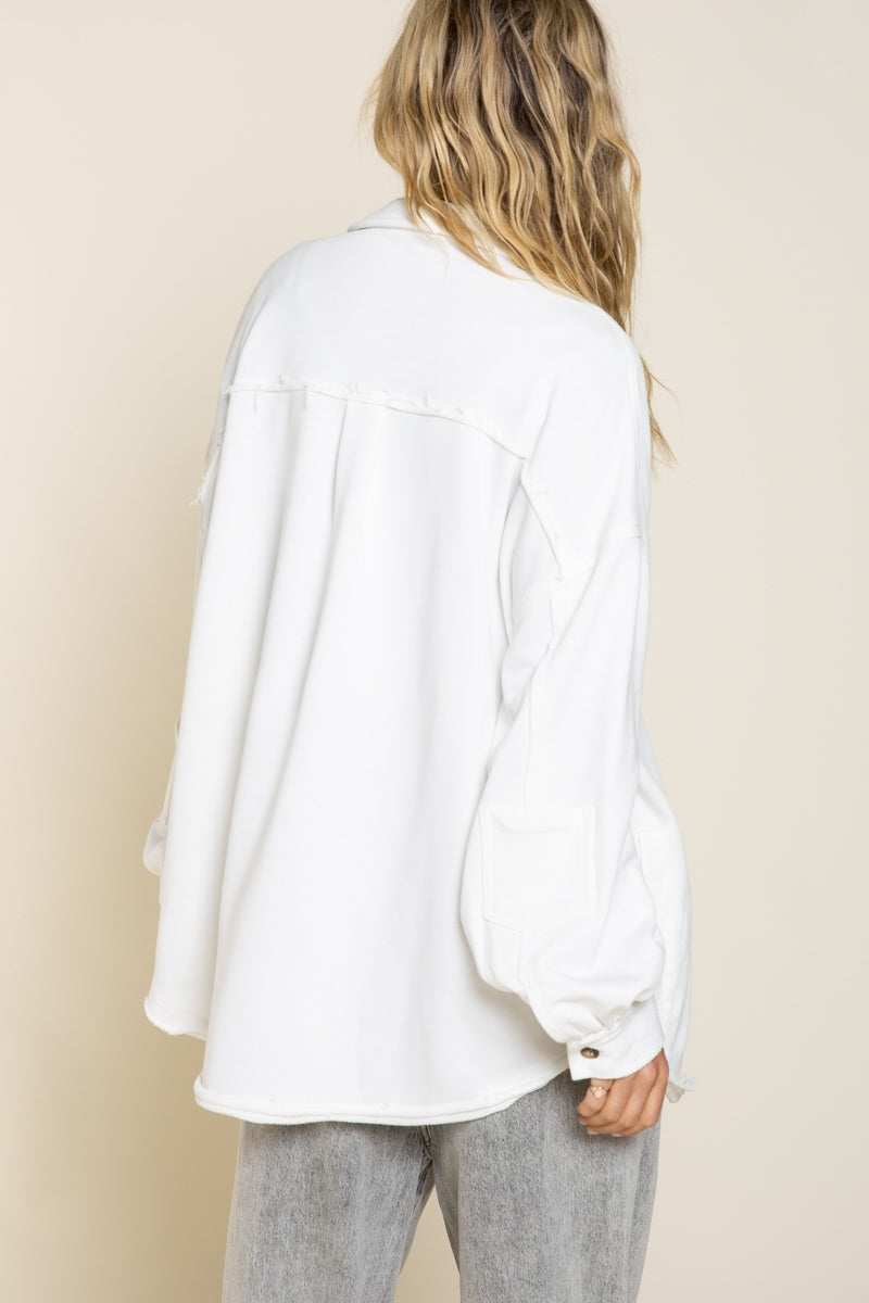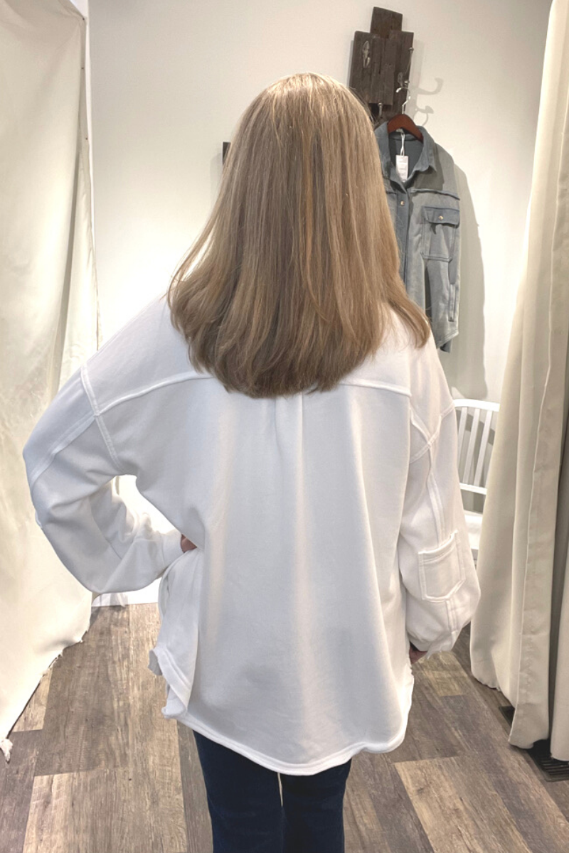 Classic pieces are everyone's favorite and our "Upgrade The Classic Look" french terry oversized jacket will be the new "classic" piece to keep in your closet. Designed in a relaxed oversized fit with vintage washed out colorway. A french terry (sweatshirt) fabric that has been flipped with inside being on the outside on the collar, button front placket closure and sleeve band for vintage vibe. A jacket with 4 pockets with 2 flap pocket on front bust and 2 bottom side pockets and finished with raw seam detailing and edge on body.