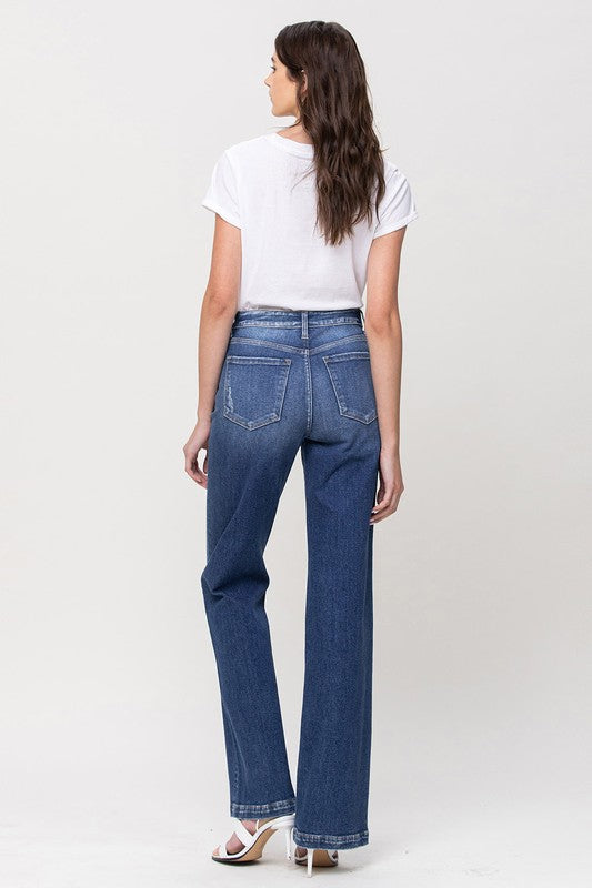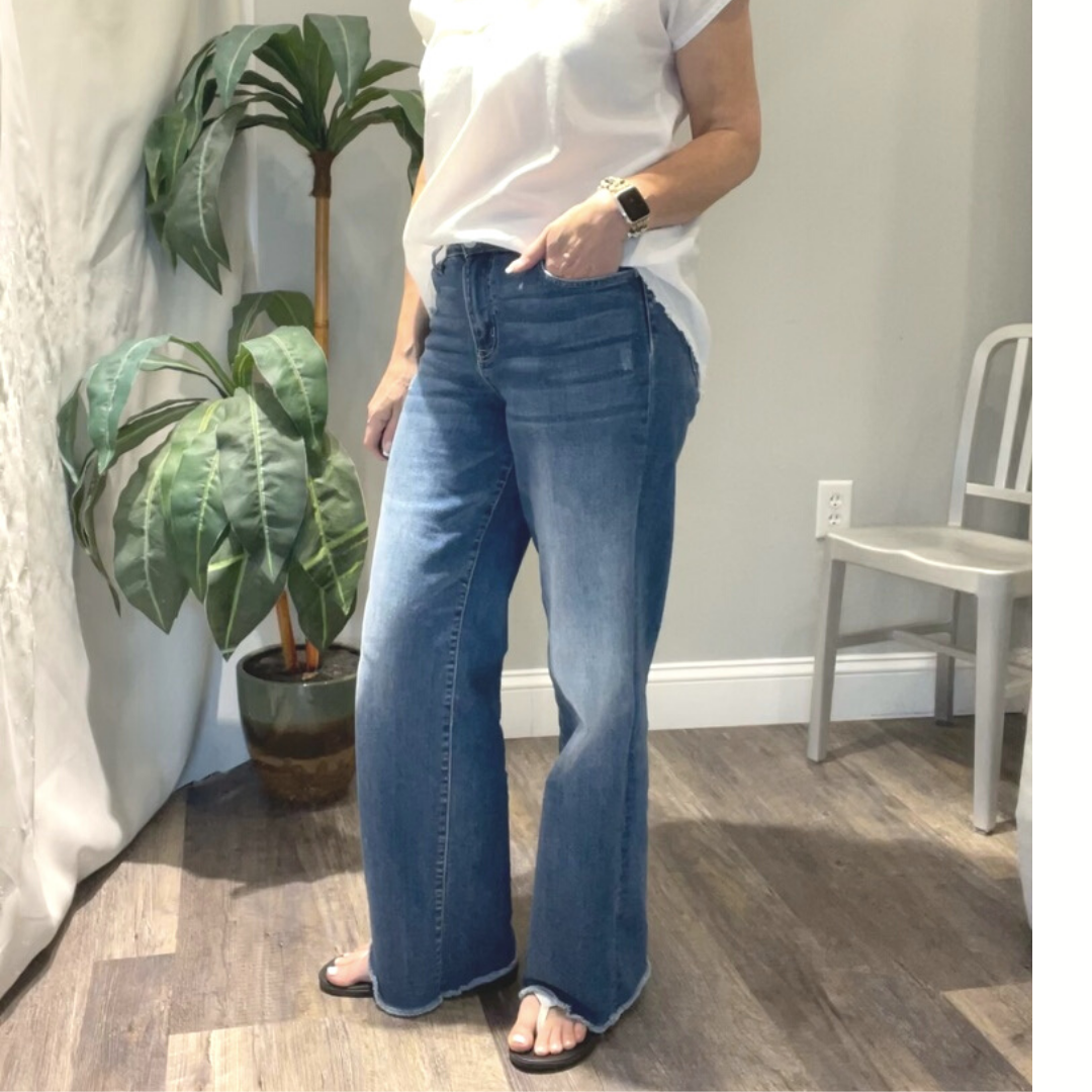 Super comfy stretch denim with high waist and wide legs. Hemline is a cute raw edge.