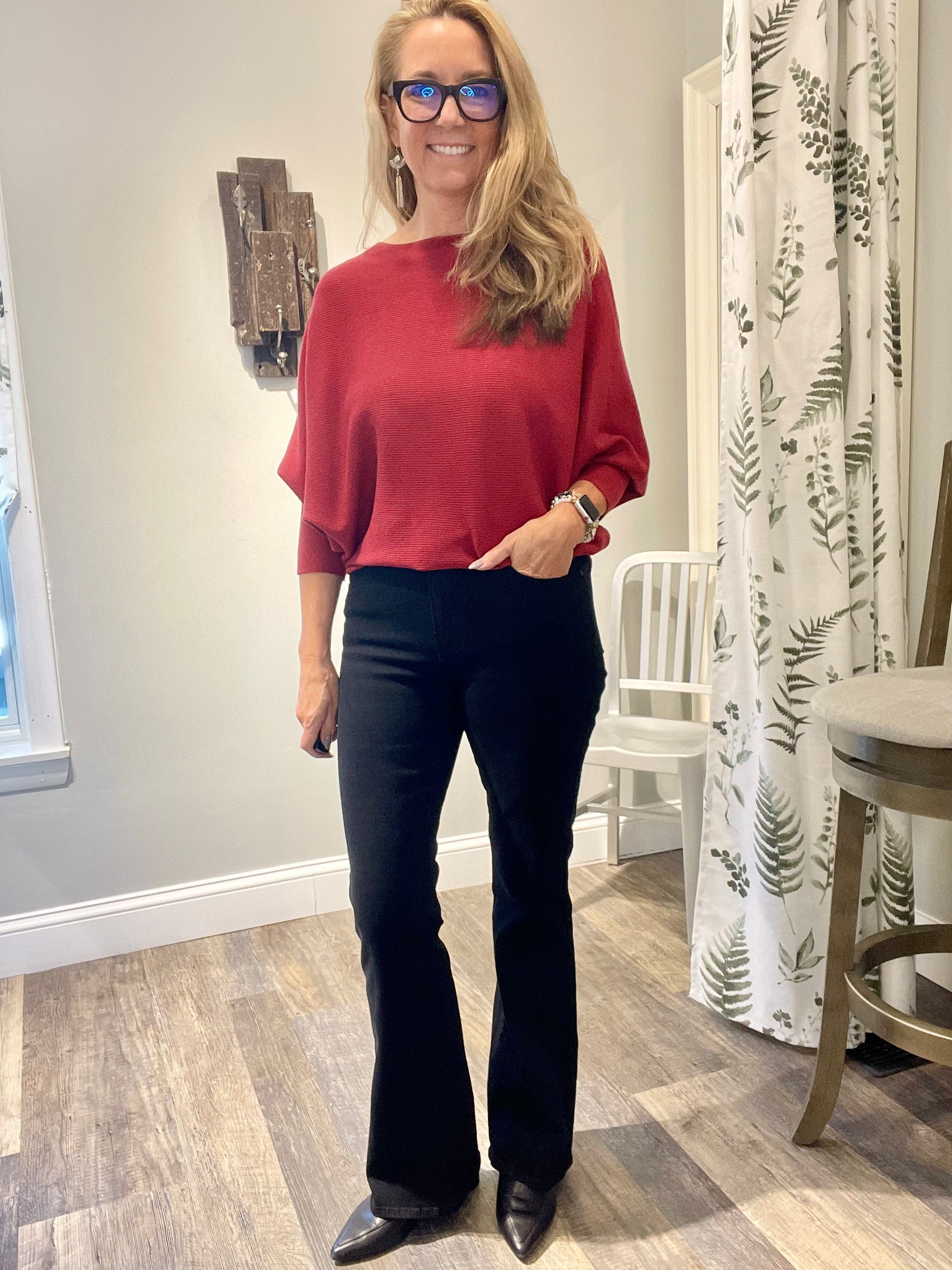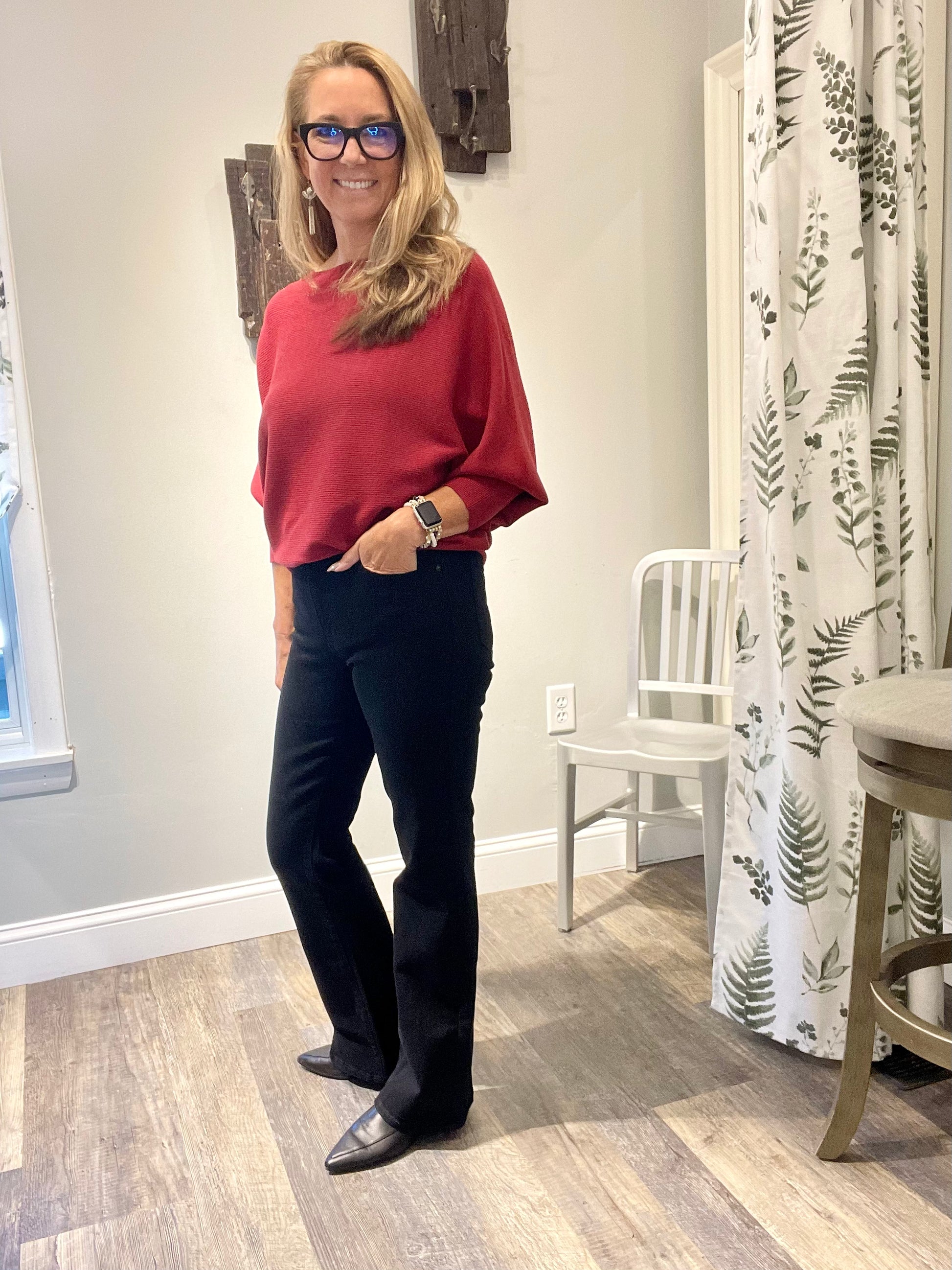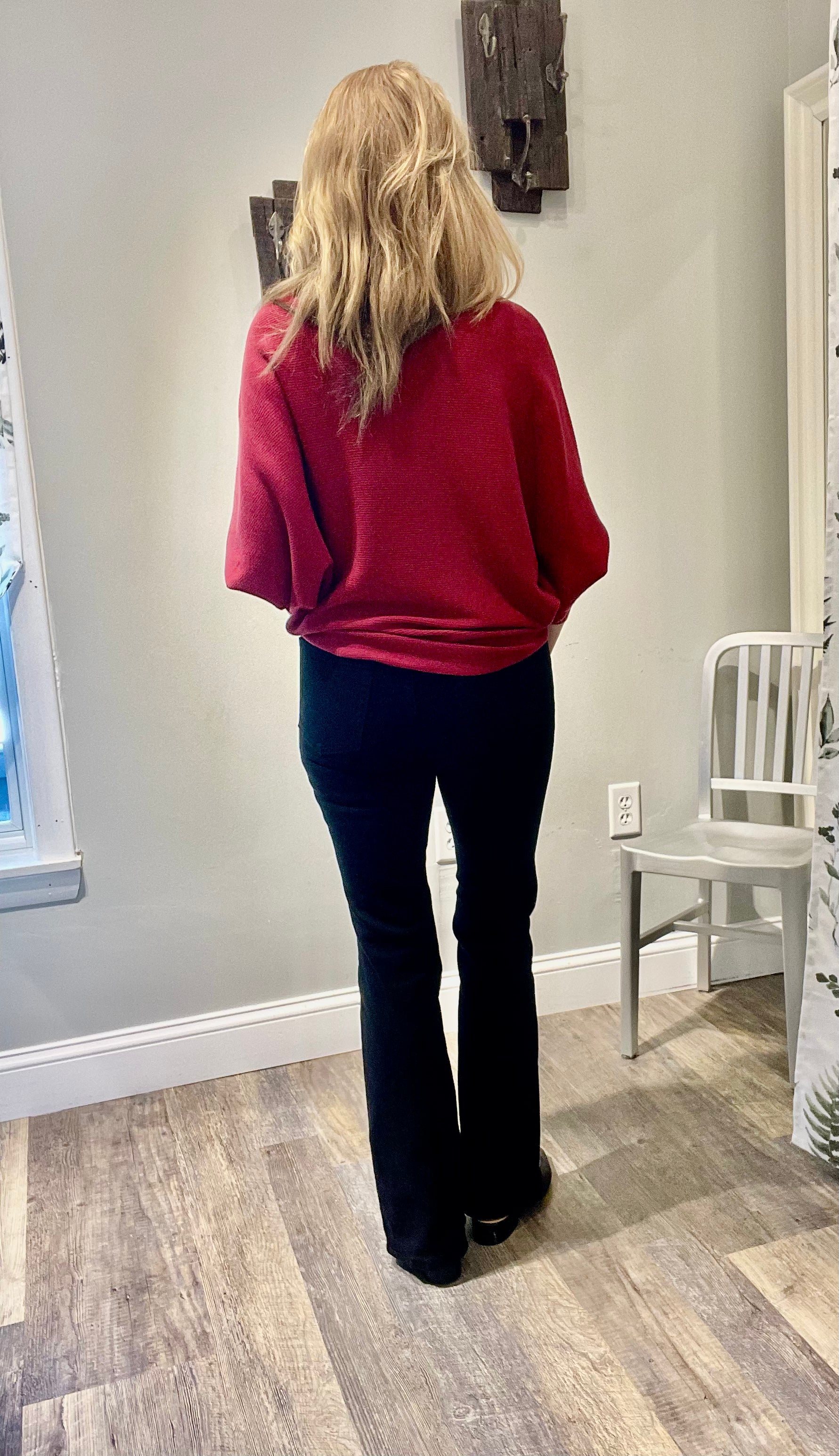 Stretchy and flattering new bootcut black denim by Just Black. Wear casually or dress these up for a night out. Pair with Kerisma Red Dolman Sweater Here!