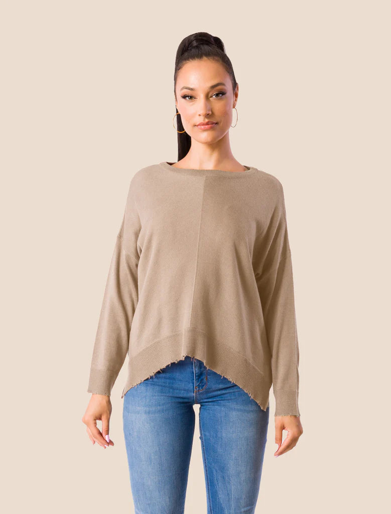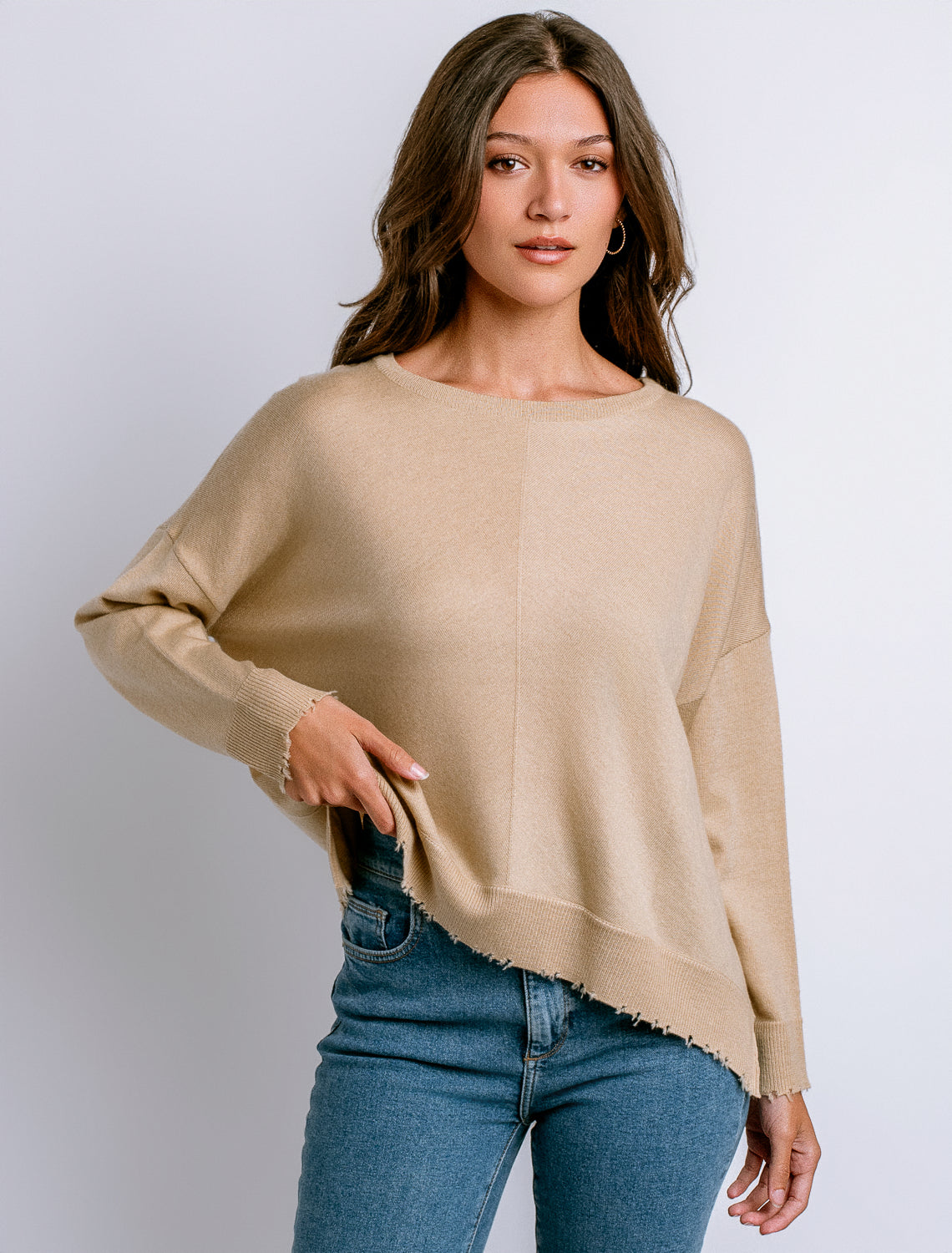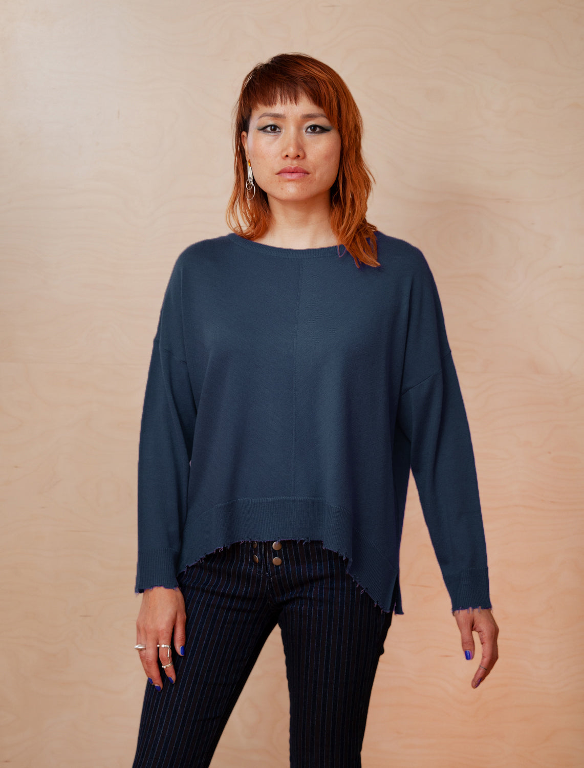 Oversized long-sleeve Crew neck top with Center seam and Ripped hem detail.Â
