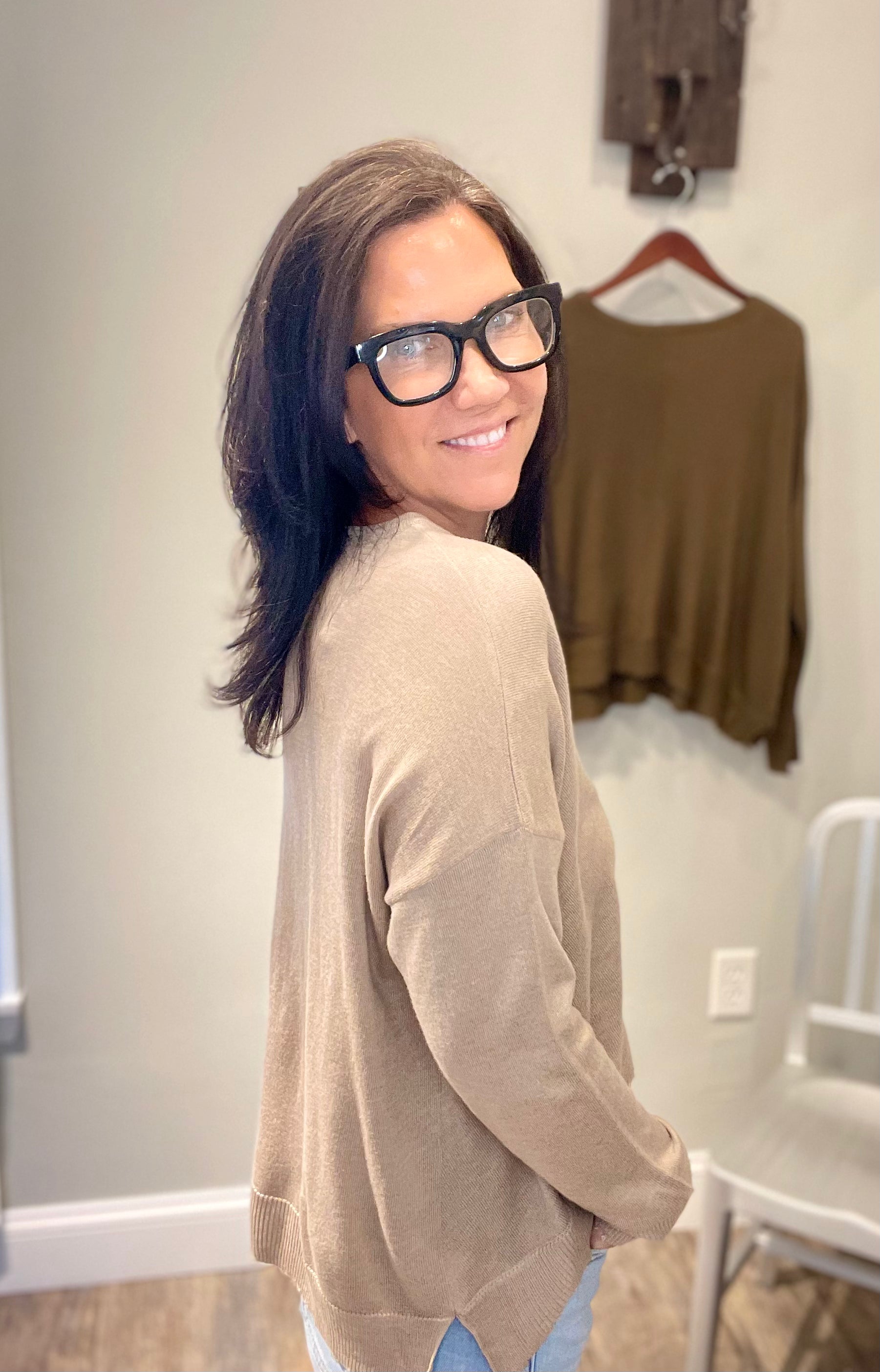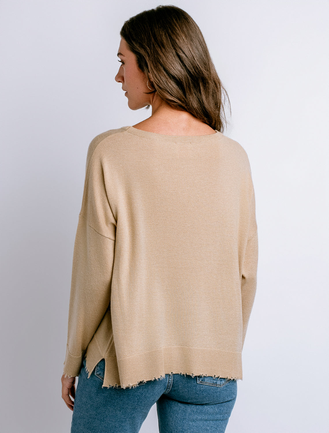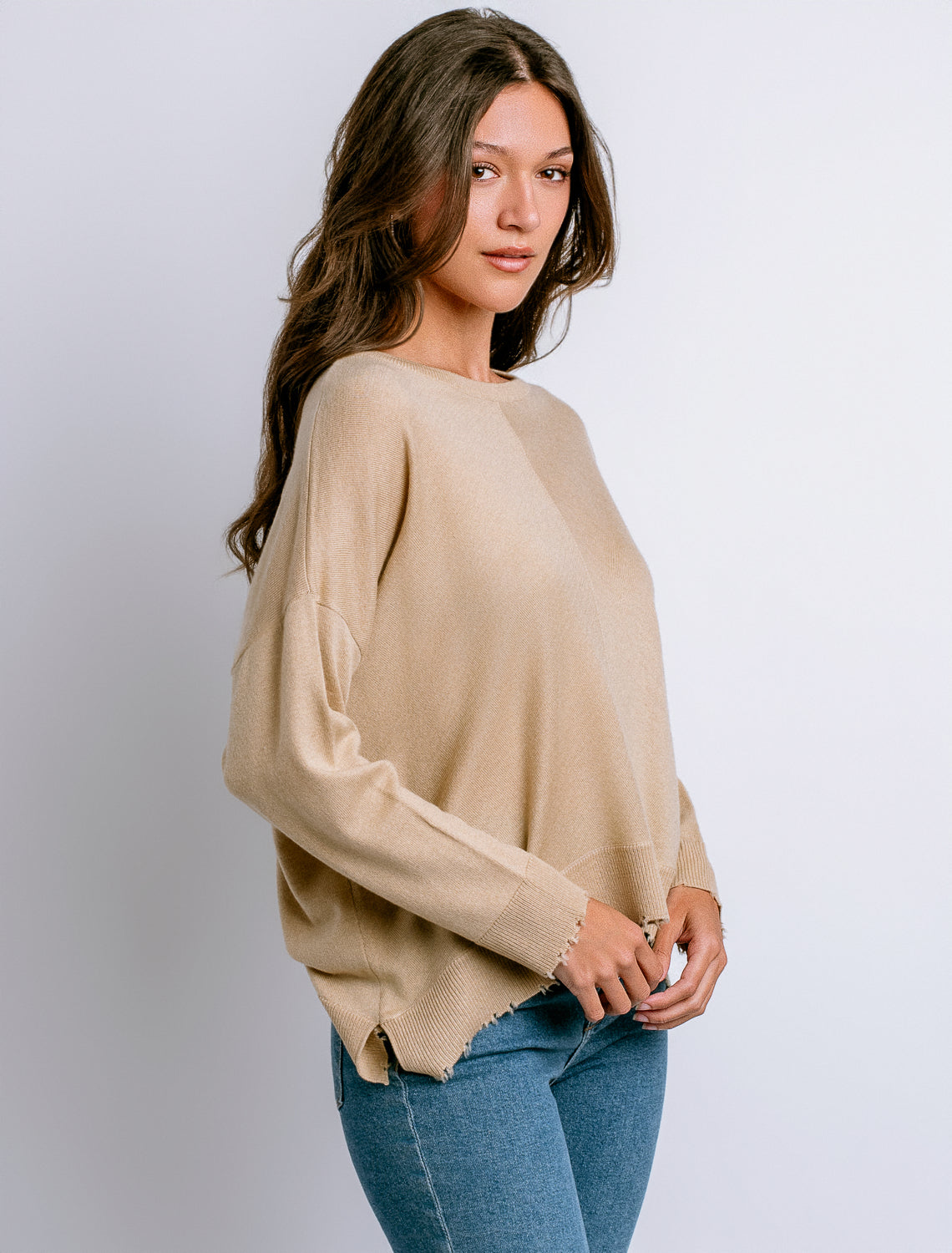 Oversized long-sleeve Crew neck top with Center seam and Ripped hem detail.Â