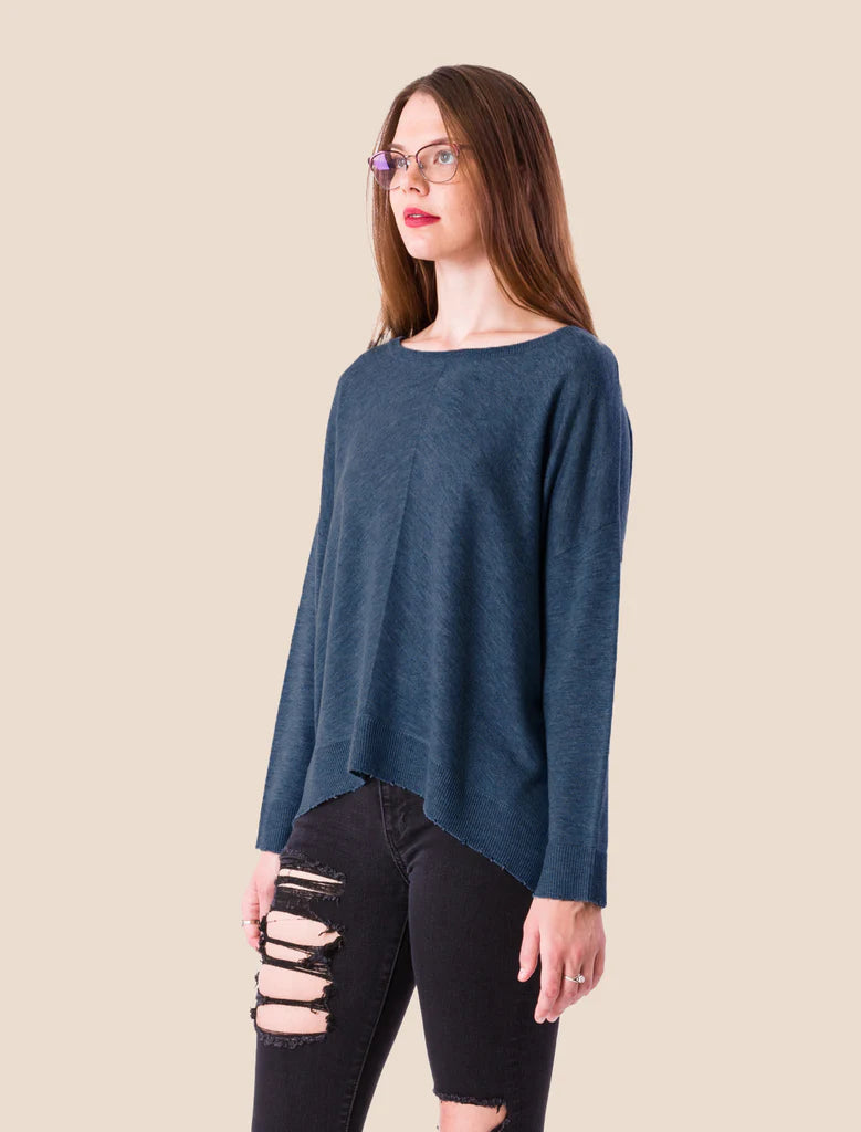 The charm of this casual top is all in the intricate details. The chevron-shaped center front seam and distressed hi/lo sweep are signatures of this design. Its voluminous shape will drape your figure in all the right places.