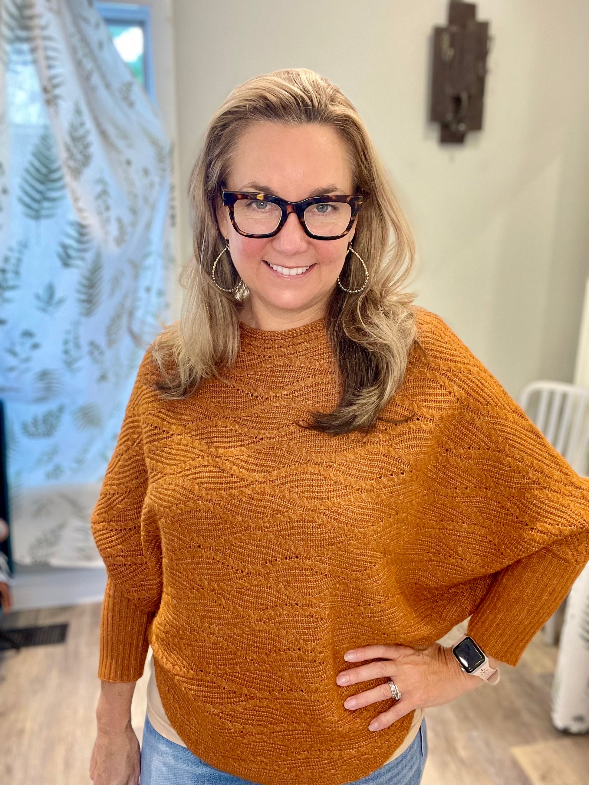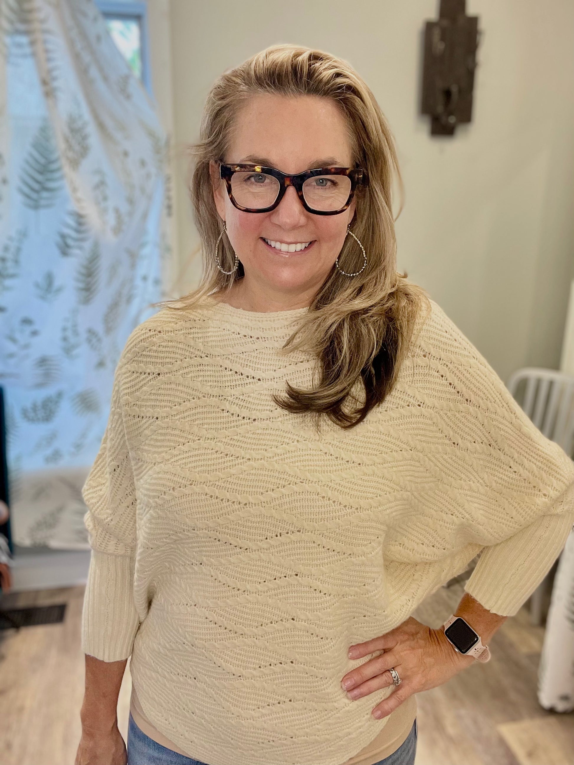 Oversized boatneck sweater with 3/4 dolman sleeves and curved in 3D Art Nouveau diamond leaf pattern.
