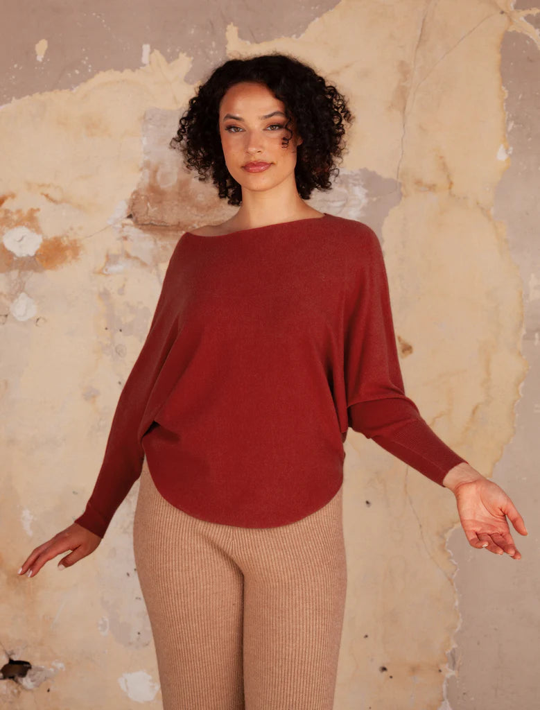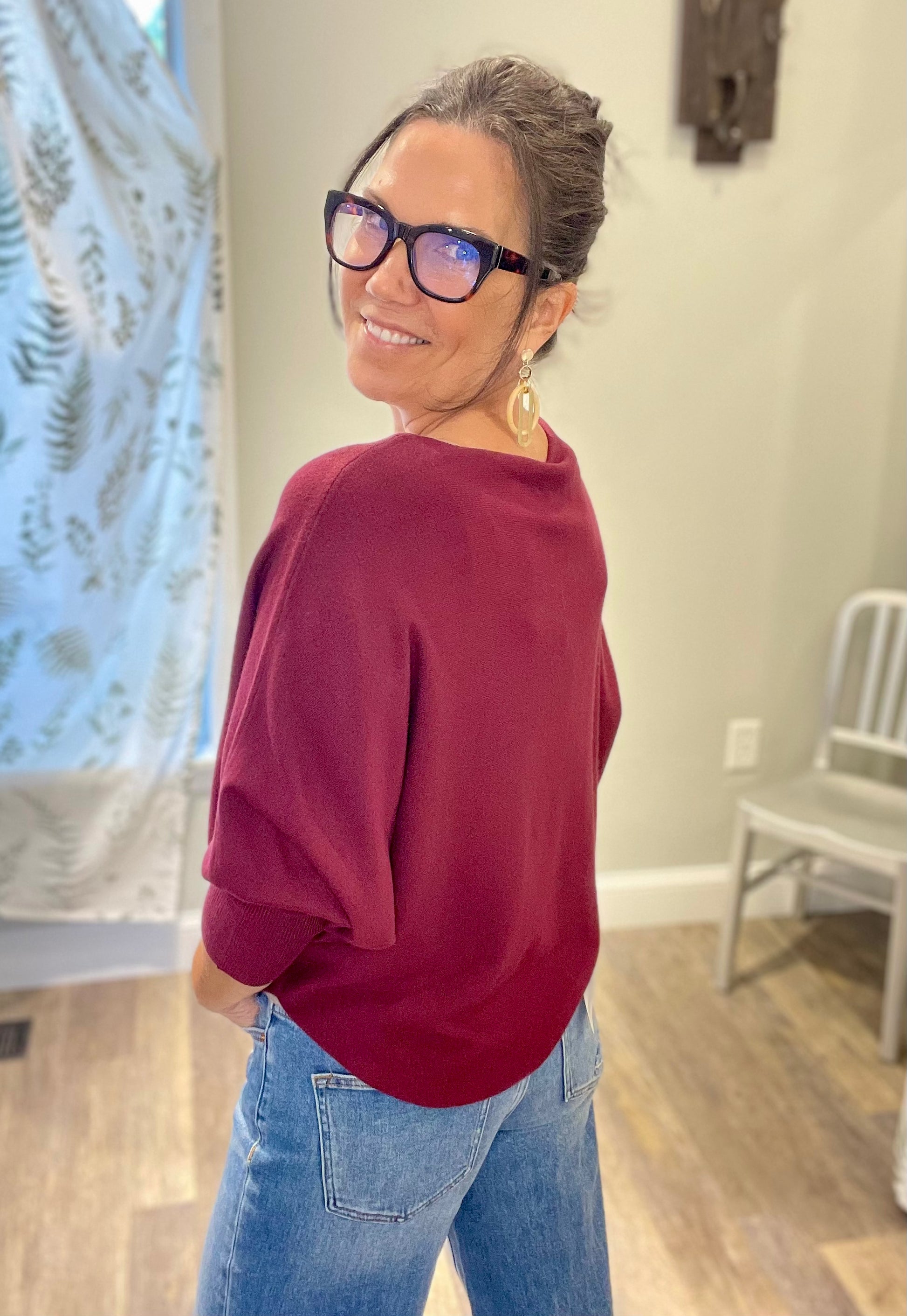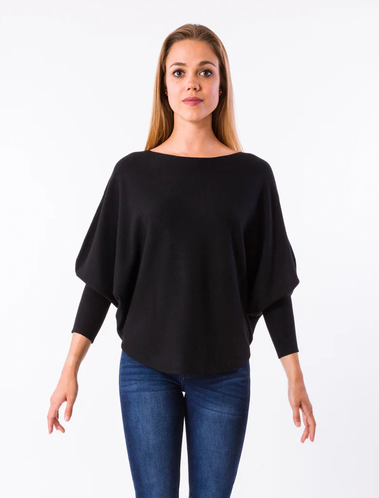 Boat neck top with 3/4 length Dolman sleeves and Curved sweep