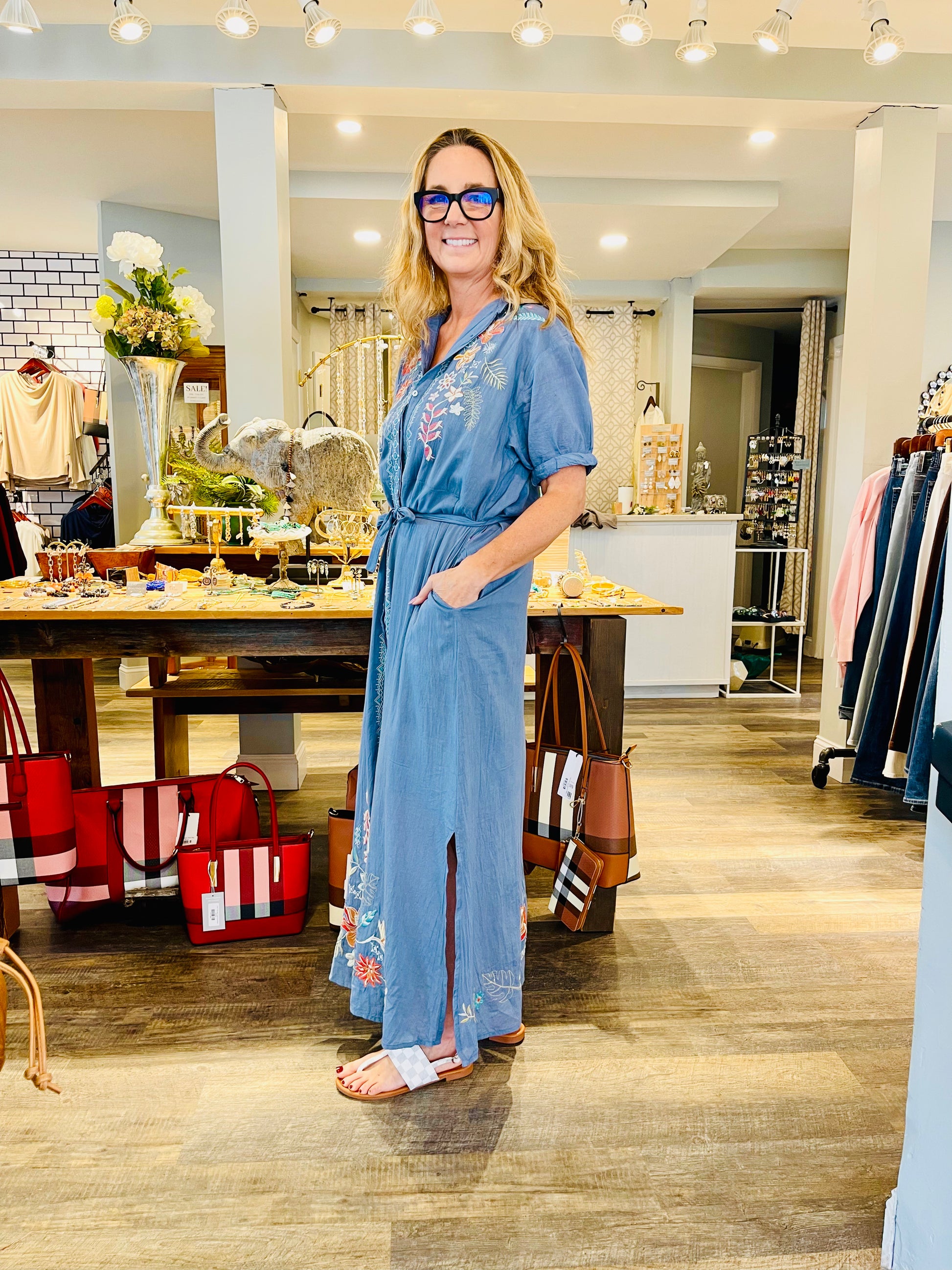 The rich baja blue hue is brought to life with intricate, placement embroidery—delicate florals and ornate detailing that frame the body with an artful, elevated touch. A classic collared neckline and full button front add timeless structure, while the self-tie waist allows for a customizable fit that cinches just right.