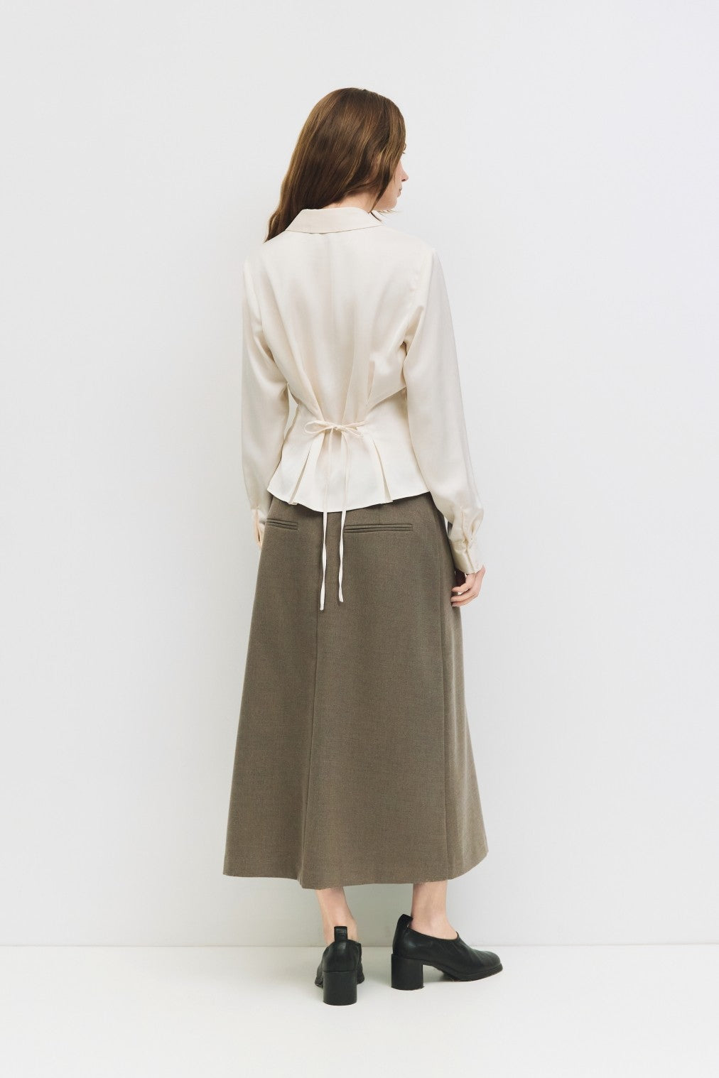 sharp collar, cuffed sleeves, and a pleated waistline for a tailored