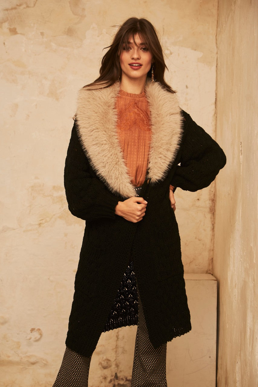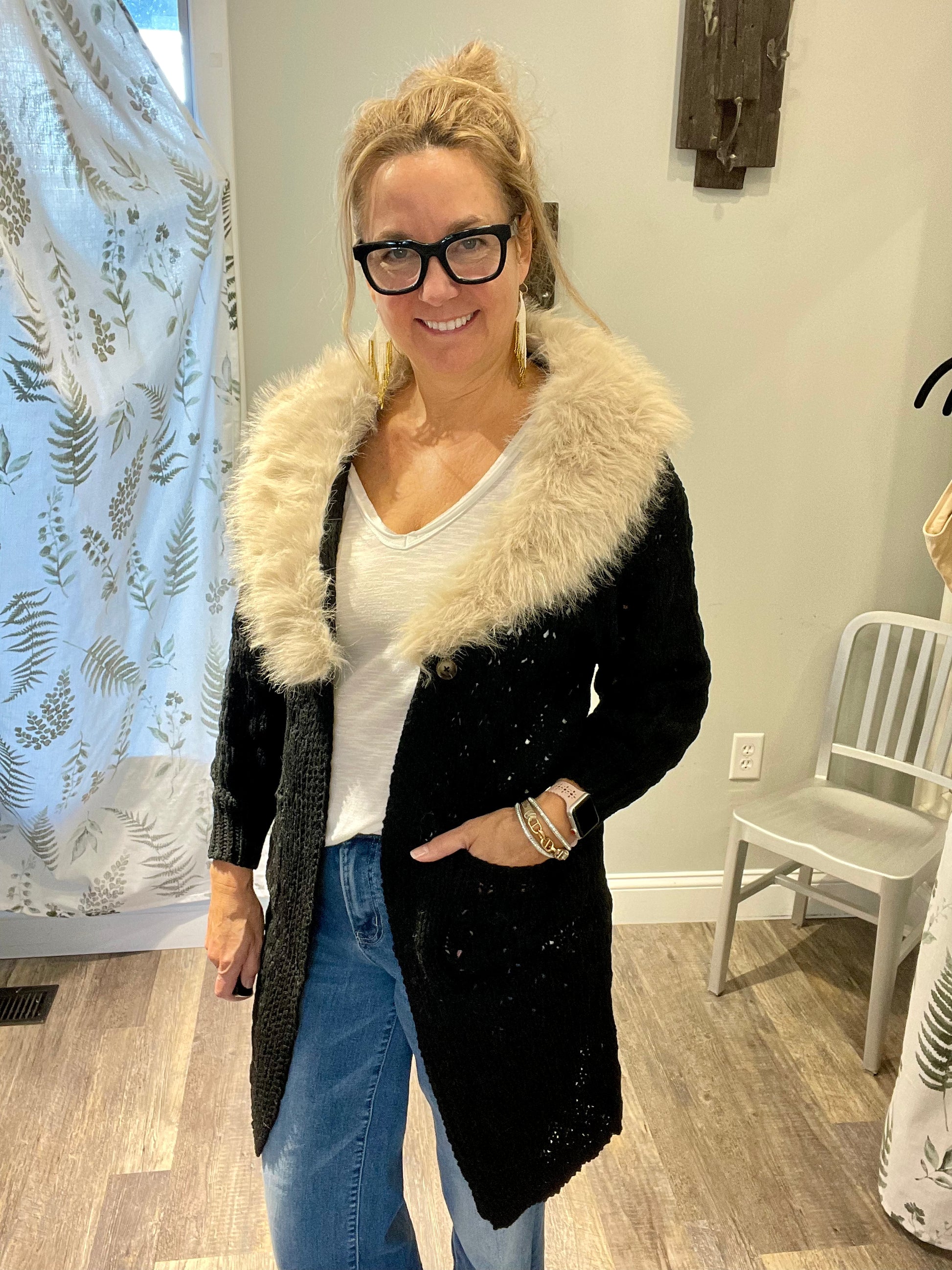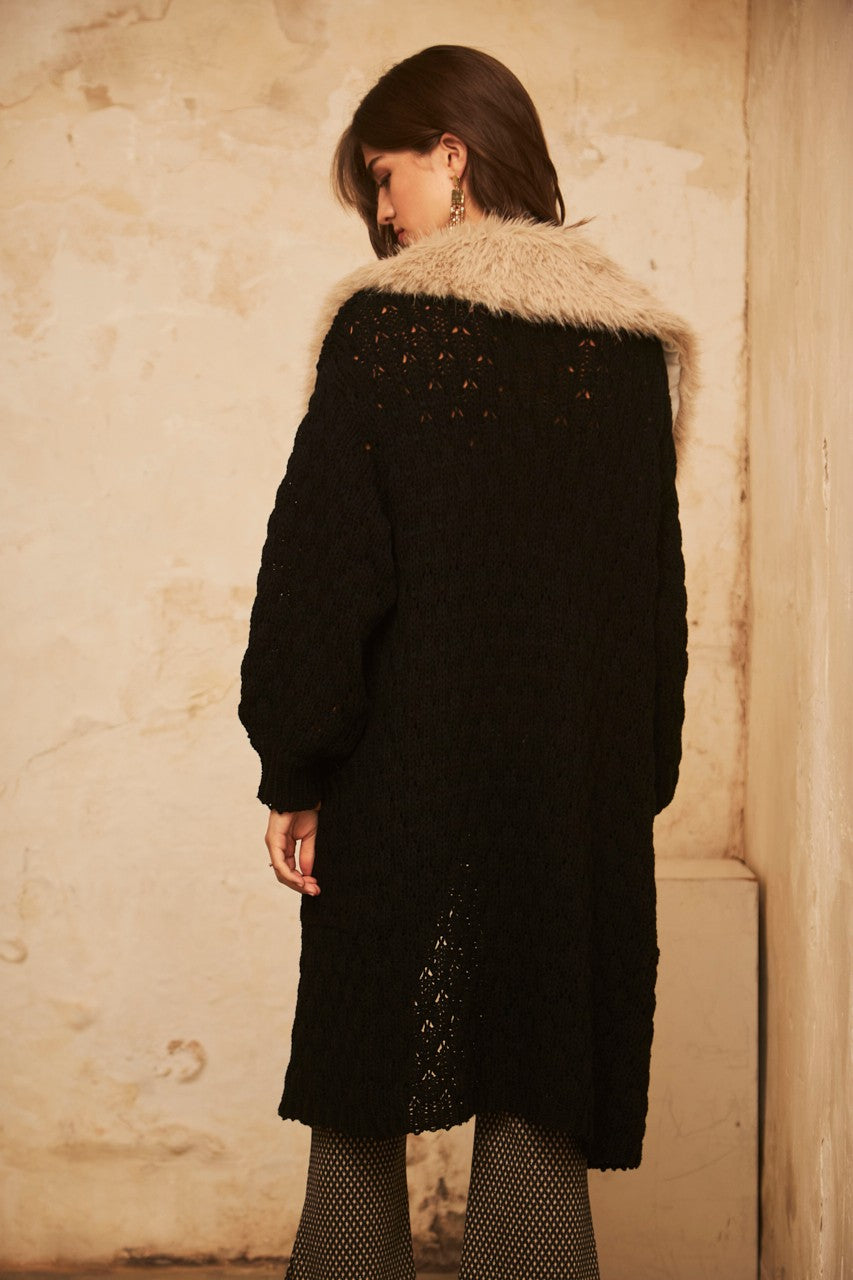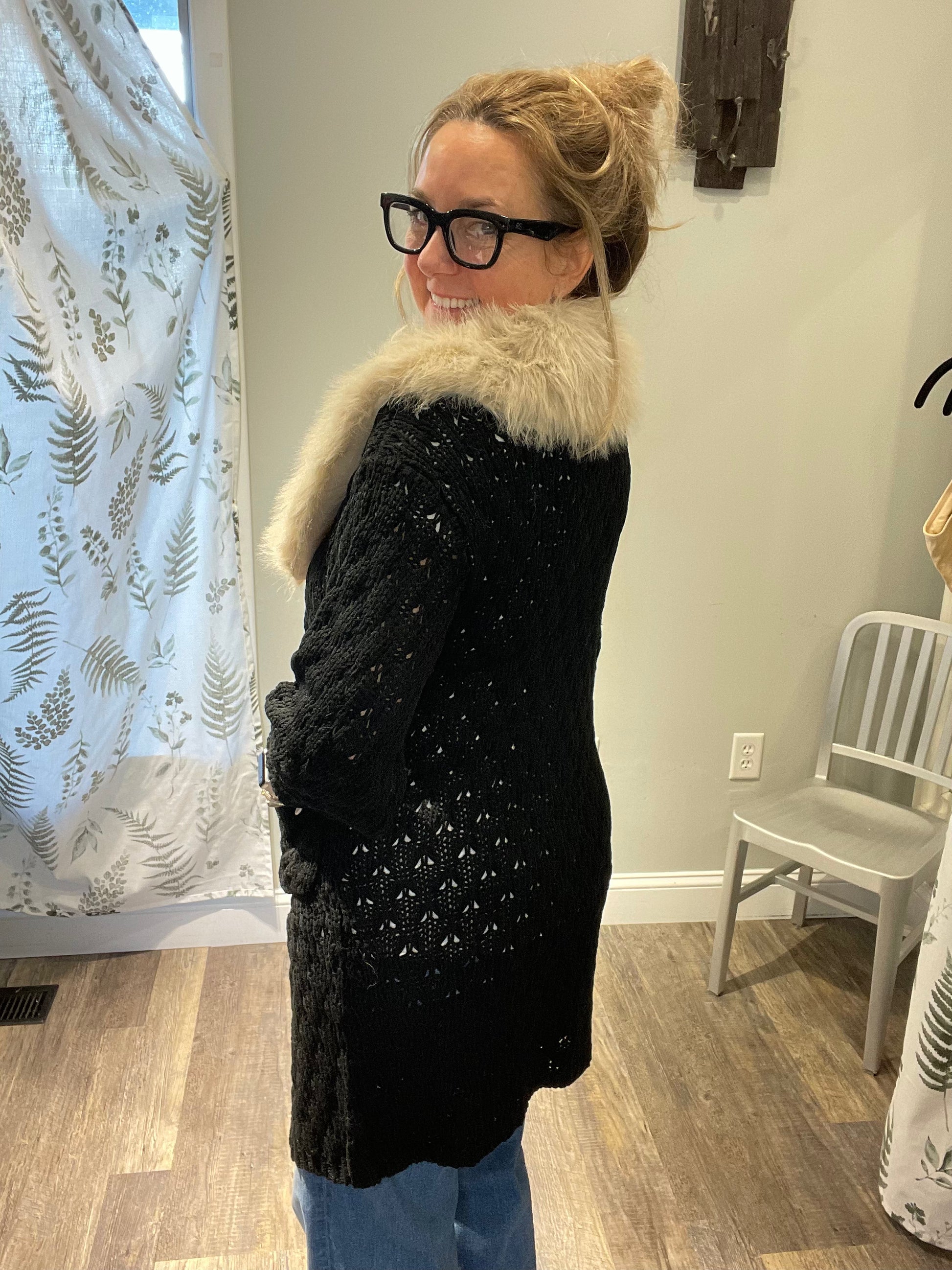 Oversize openwork knit cardigan. Detachable faux fur collar detail. Front pockets and button closure. Leaf is wearing the S/M.