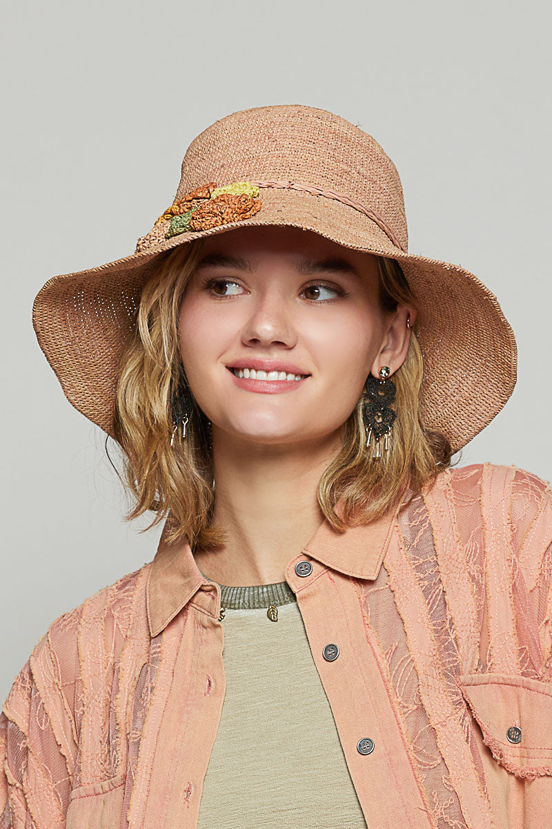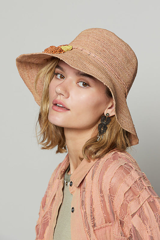 It has a wide brim and is accented with decorative flowers in warm, earthy colors, adding a playful and textured element to its design.