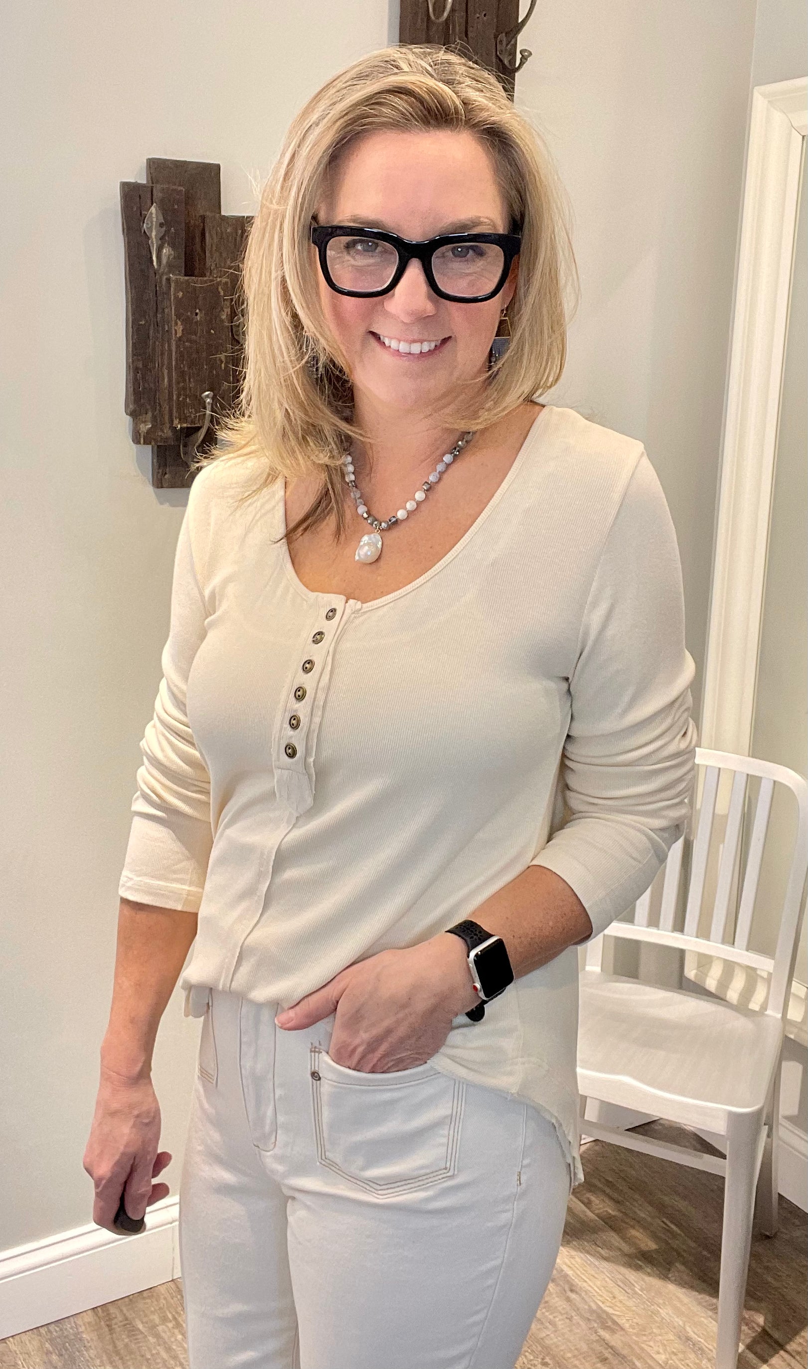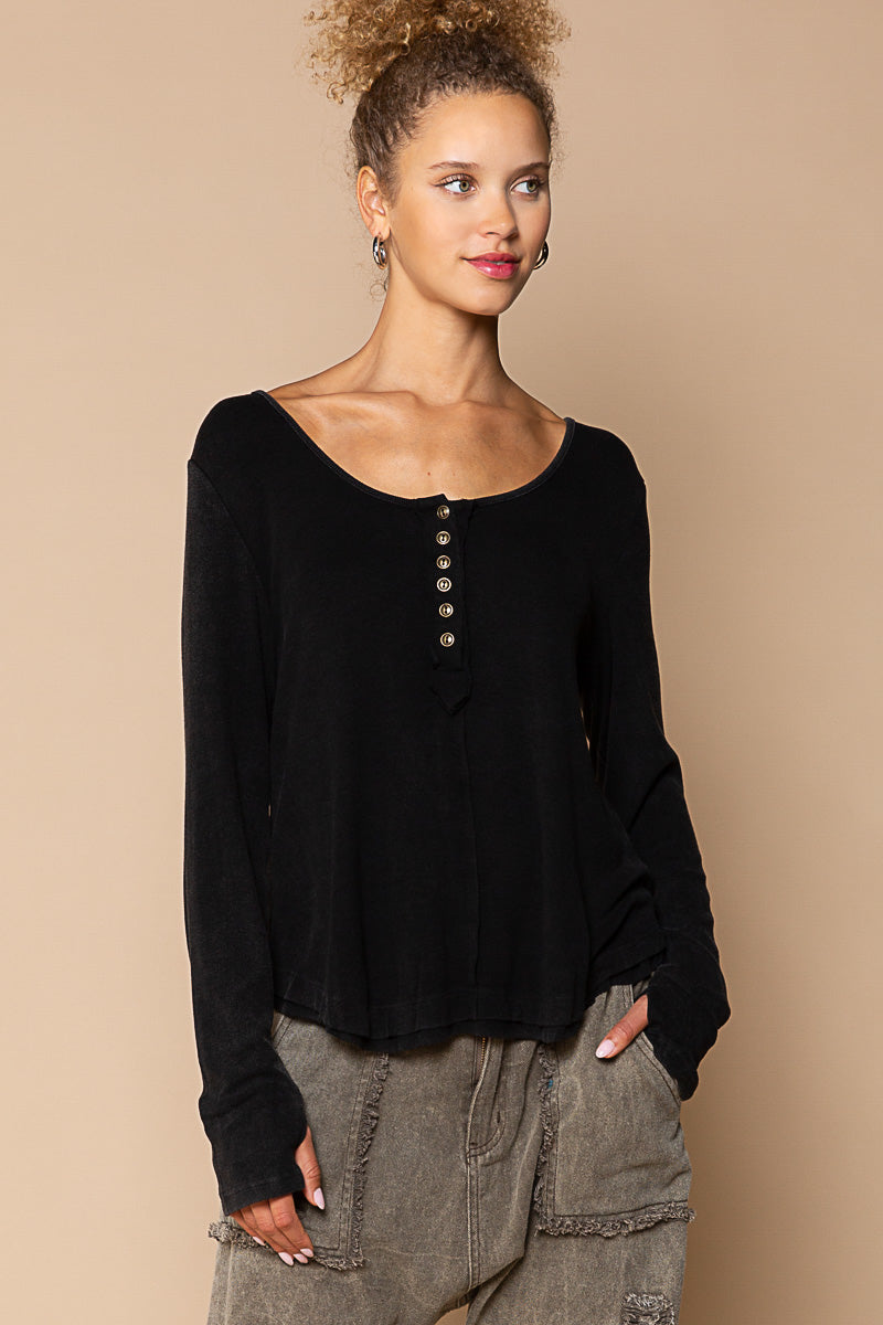 Designed in t-shirt with wide round neckline, oversized fit with long sleeve, button closure, double layered hem, raw edge detailing, featured in ribbed fabric.