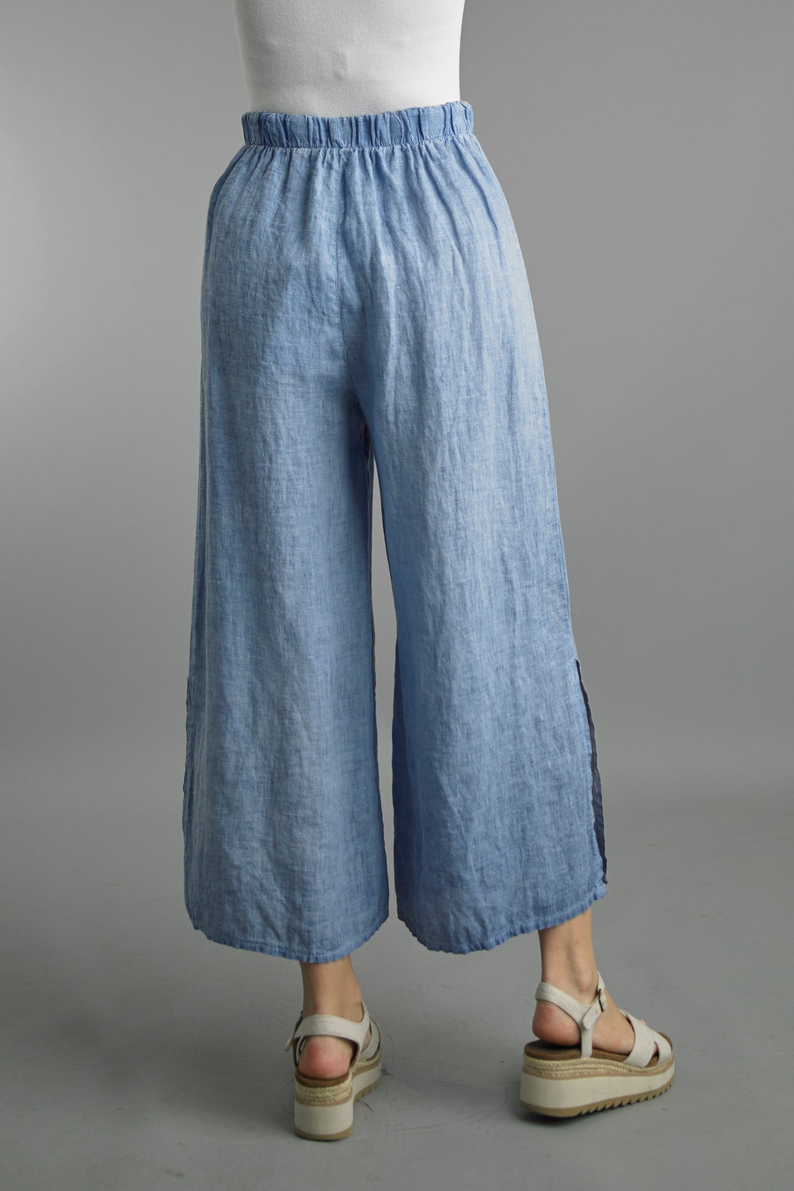 Pretty linen pants by Tempo Paris are perfect for Spring / Summer! Elastic waist with drawstring and slits at the leg make for an easy breezy pant. True to size.