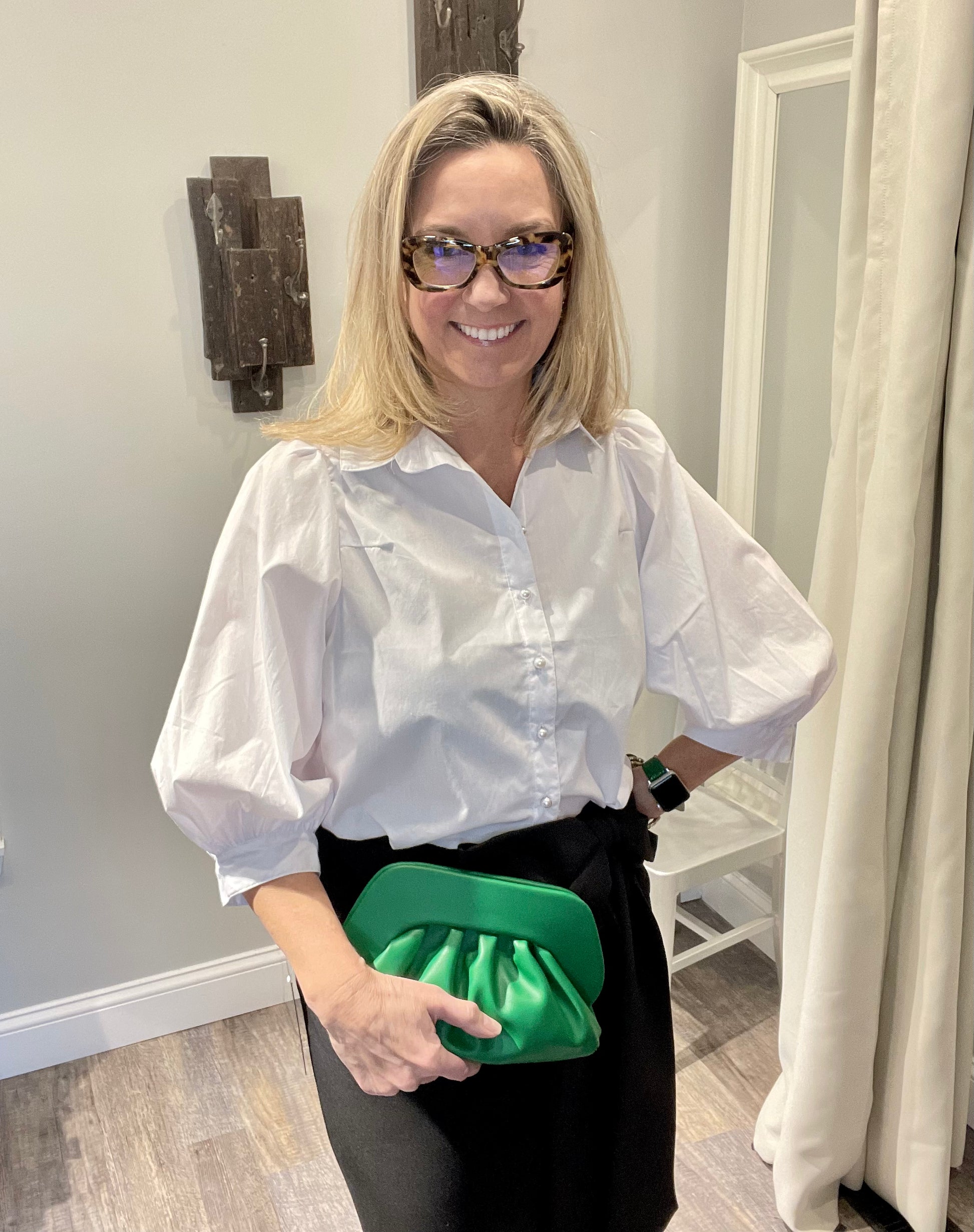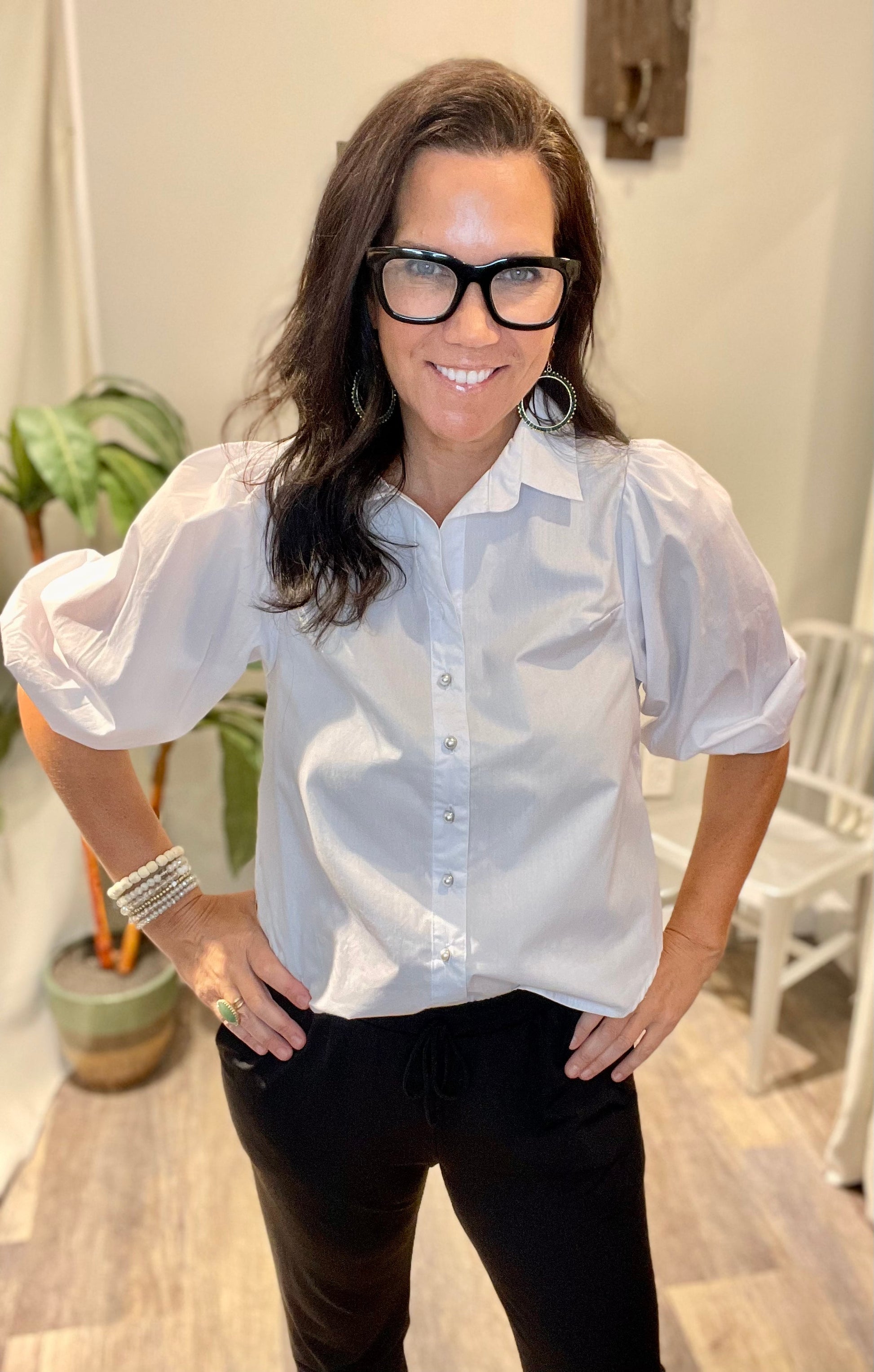 Gorgeous new top with pearl buttons at the front and on 3/4 puff sleeve. Wear out or with a French tuck.