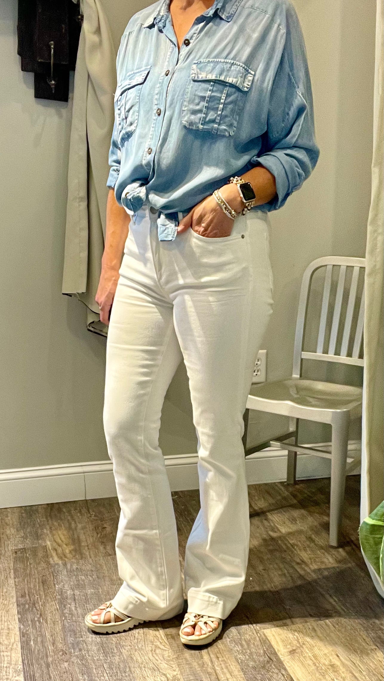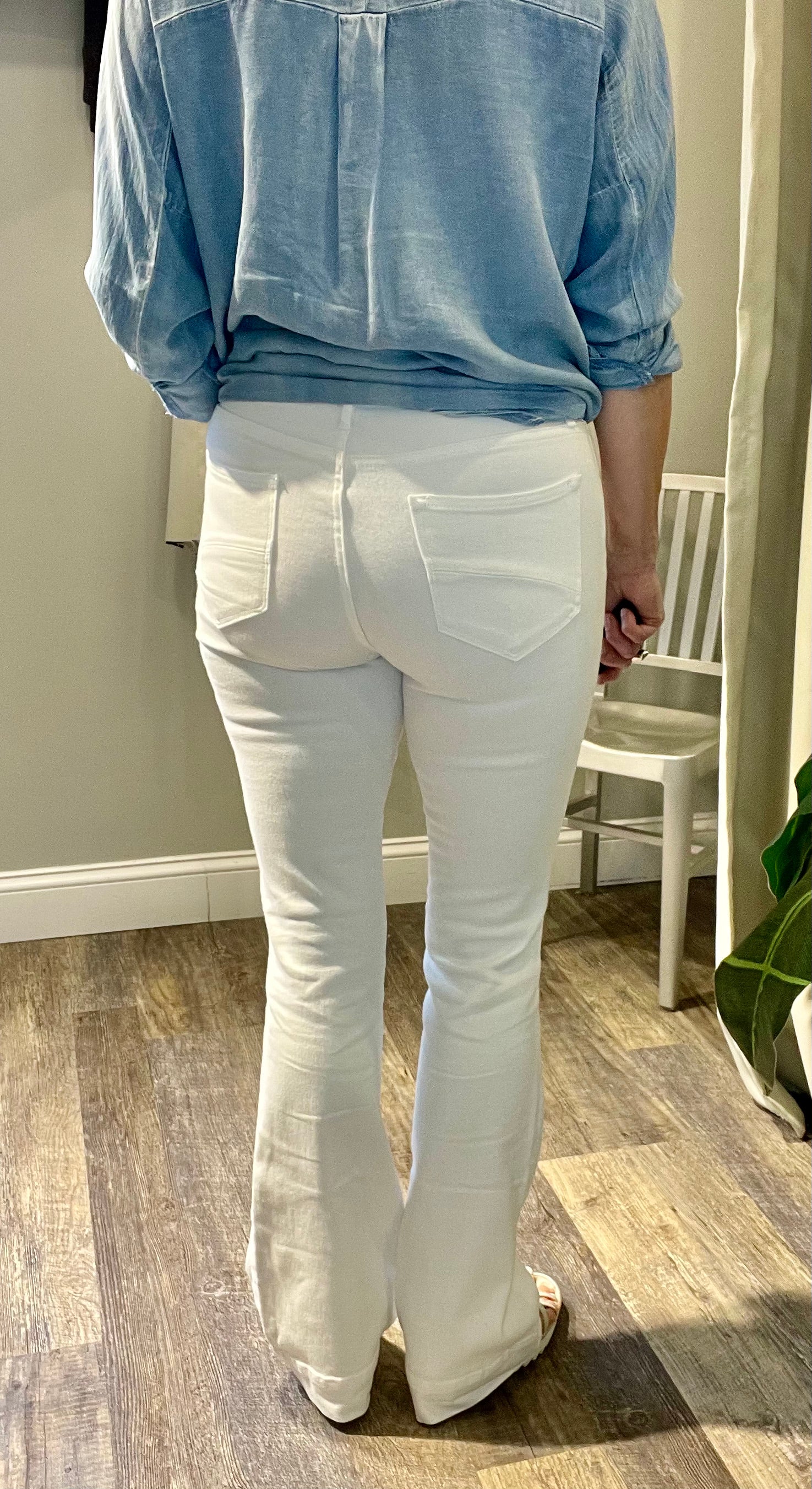 Wyatt trouser boot cut in basic white. True to size, Leaf is wearing a 28.